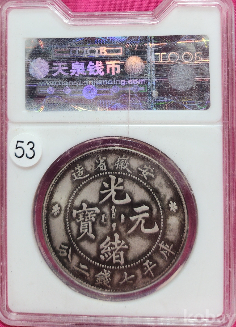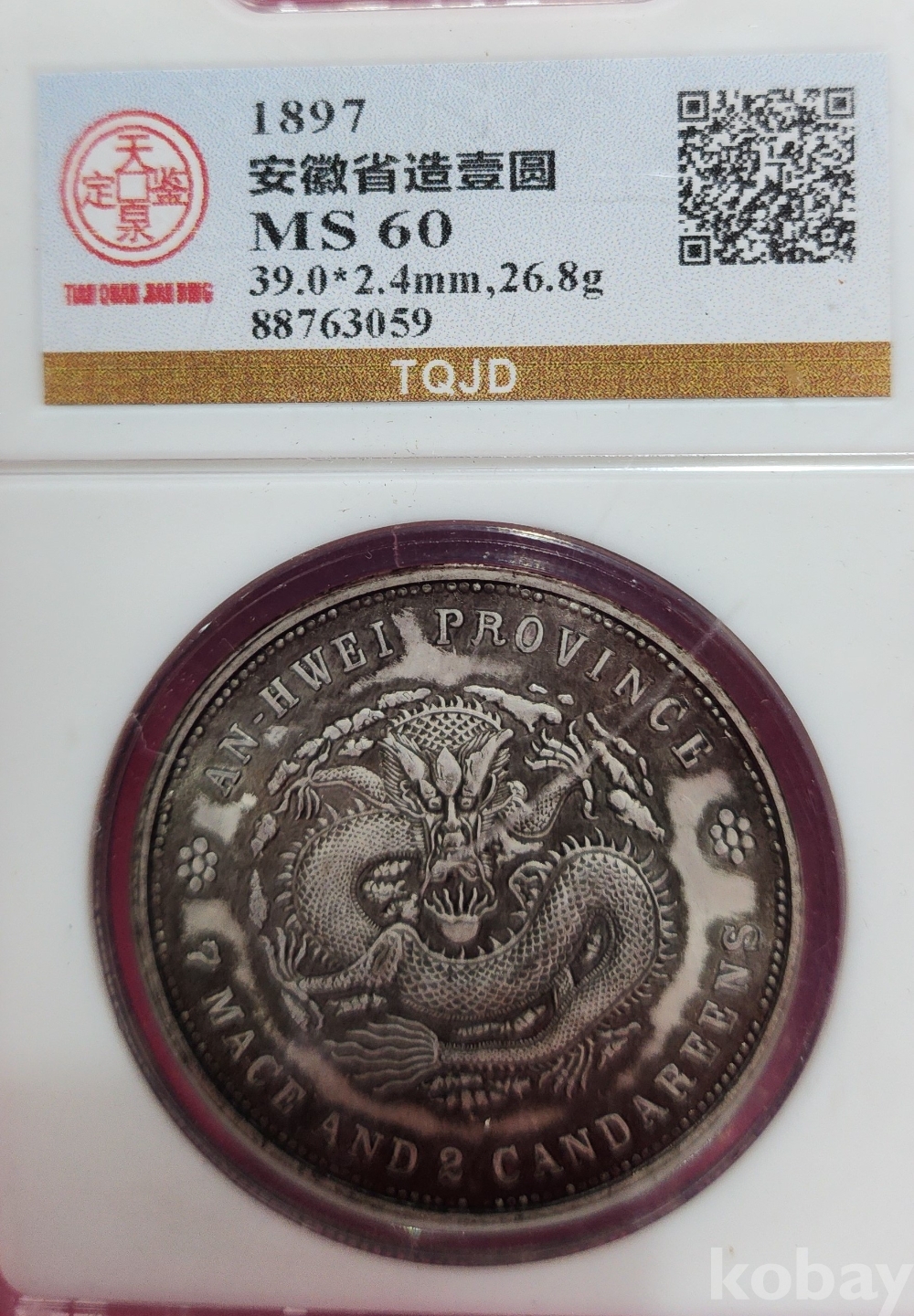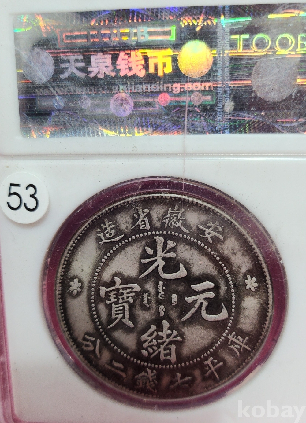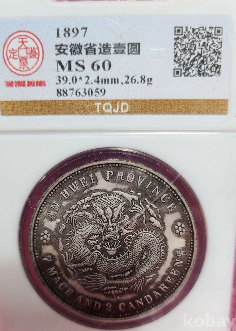 1897년 큐알코드(QR CODE)가 함께하는 은색 광서원보 (光緖元寶)' 화패로 밀봉된 상태입니다,