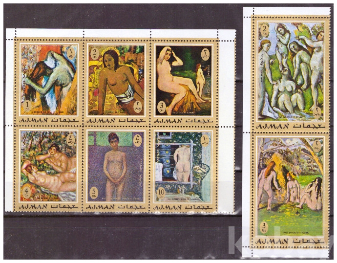 (누드명화) Ajman(아지만) 1971 에드가 드가의 <화장실에 있는 여자>외 sheet of 6+pair MNH