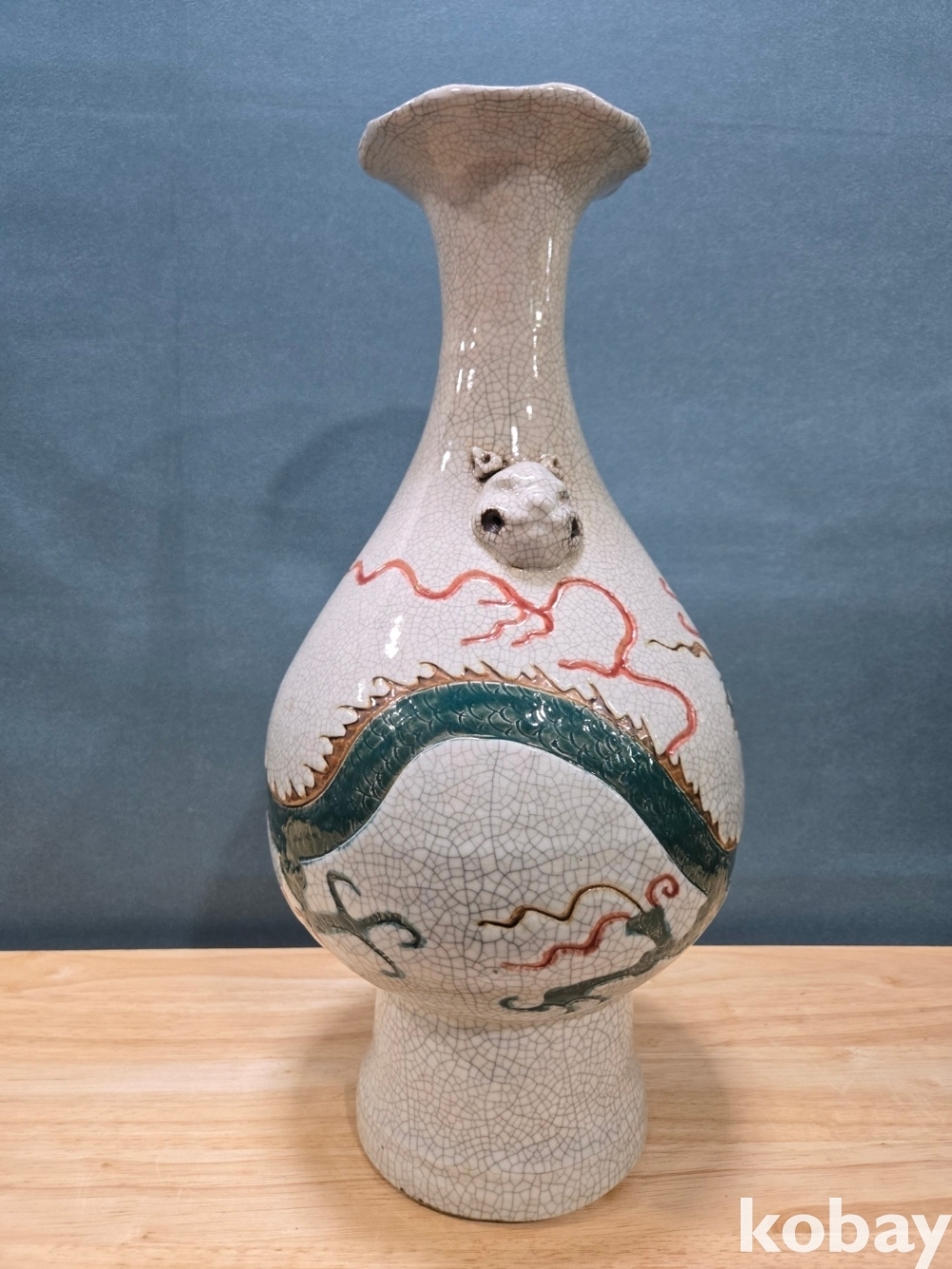 초록 용이 몸통을 휘감겨 있는 화형 양이 도자기 입니다.