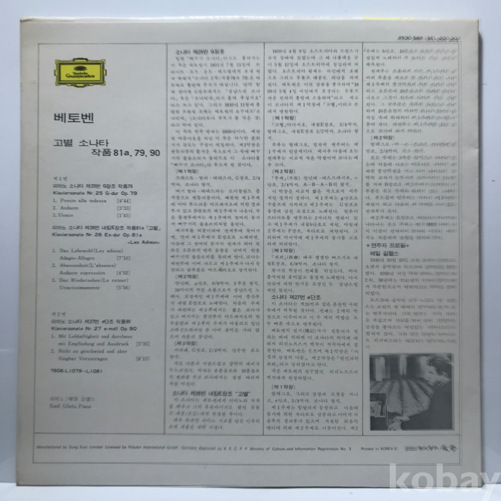 LP 34,910-39 베토벤 고별 소나타 작품 81 - 에밀 길레스 . ` 79 성음 자켓 EX+ 알판 NM