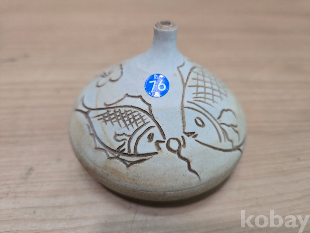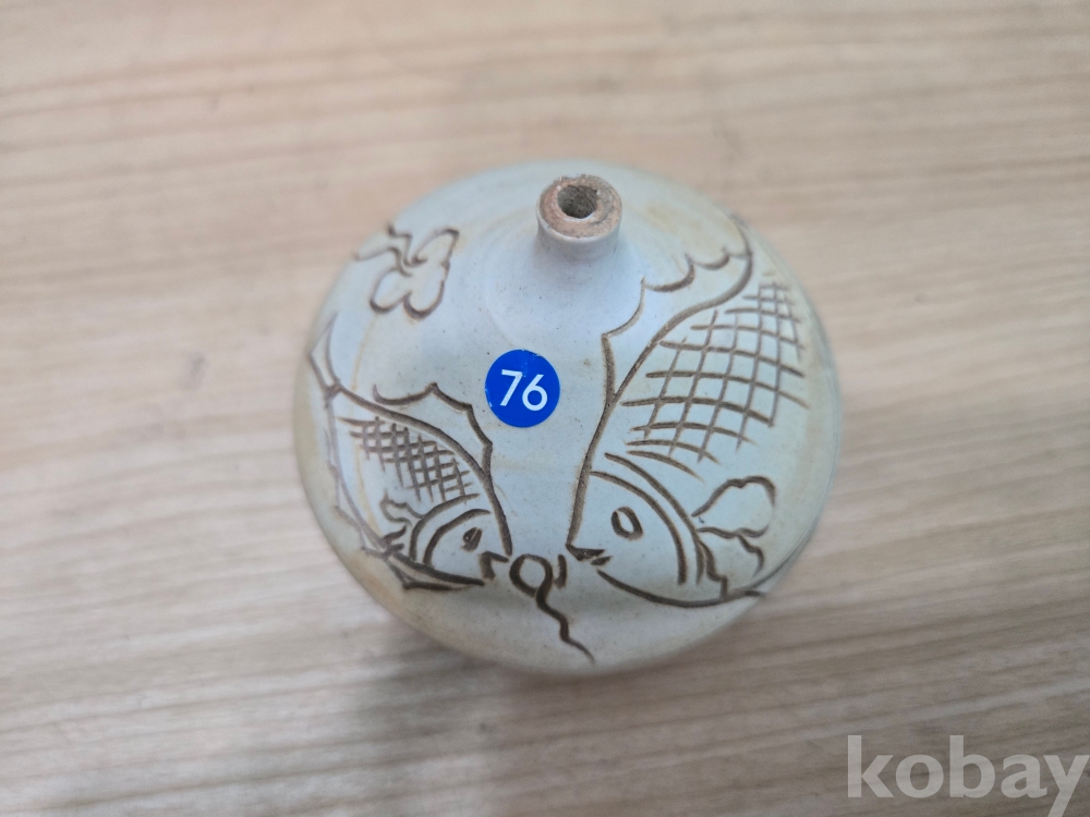물고기 문양이 음각으로 표현된 입이 작은 도자기 입니다.