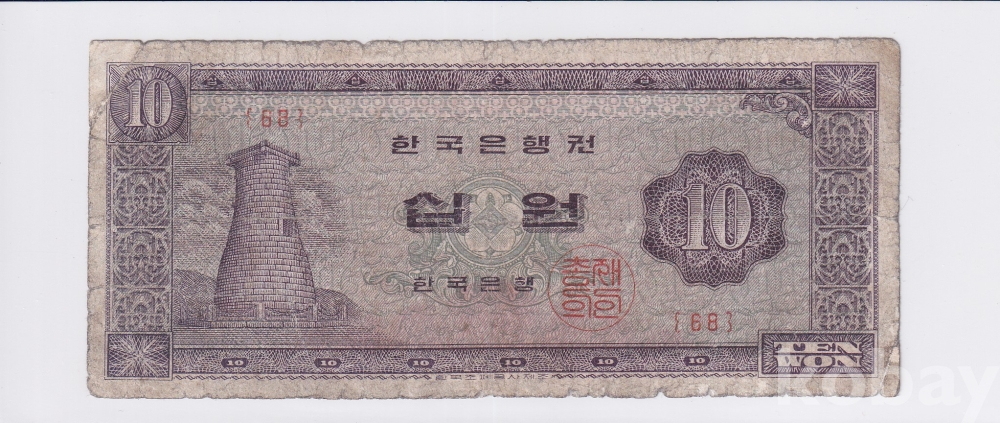 - 한국은행 1965년 유년도 첨성대 십원 판번호 68번 미품 지폐