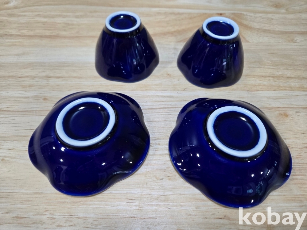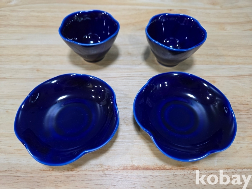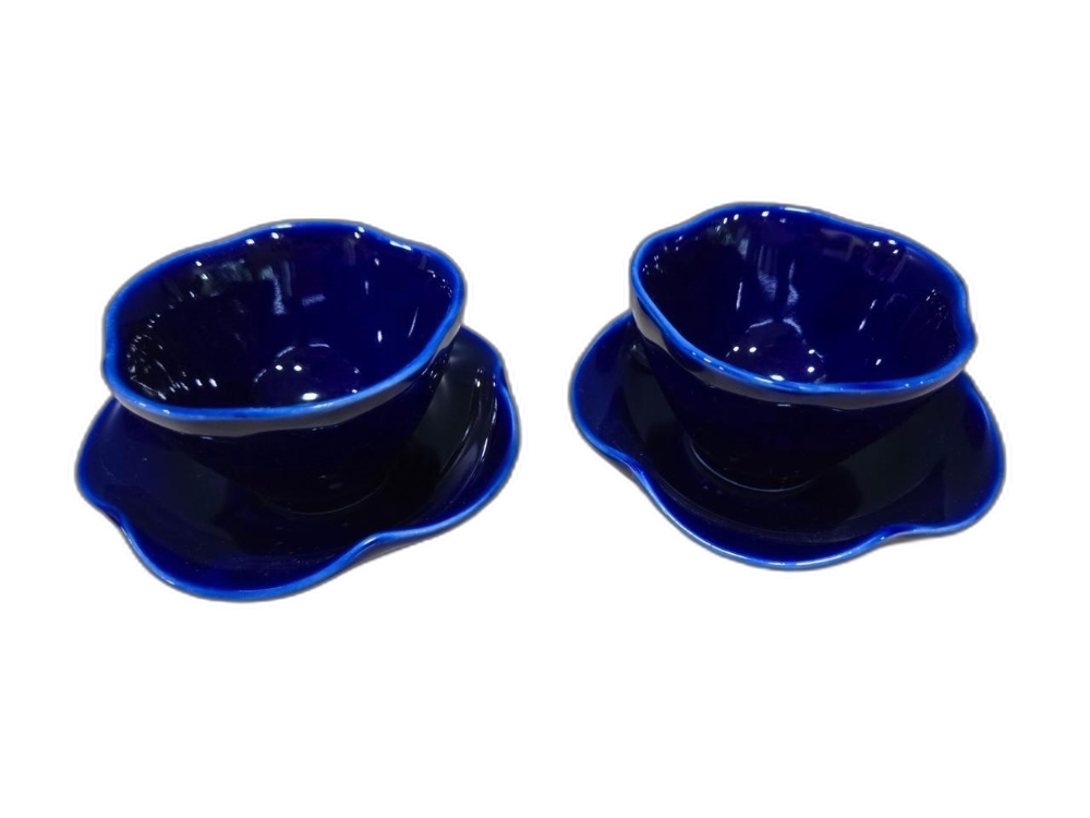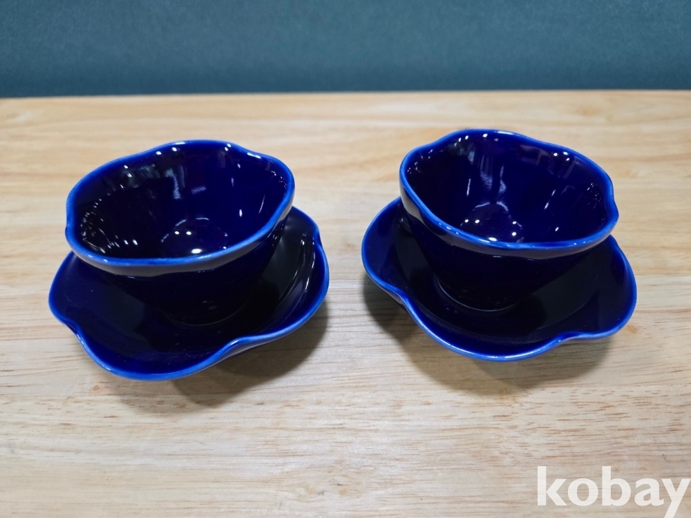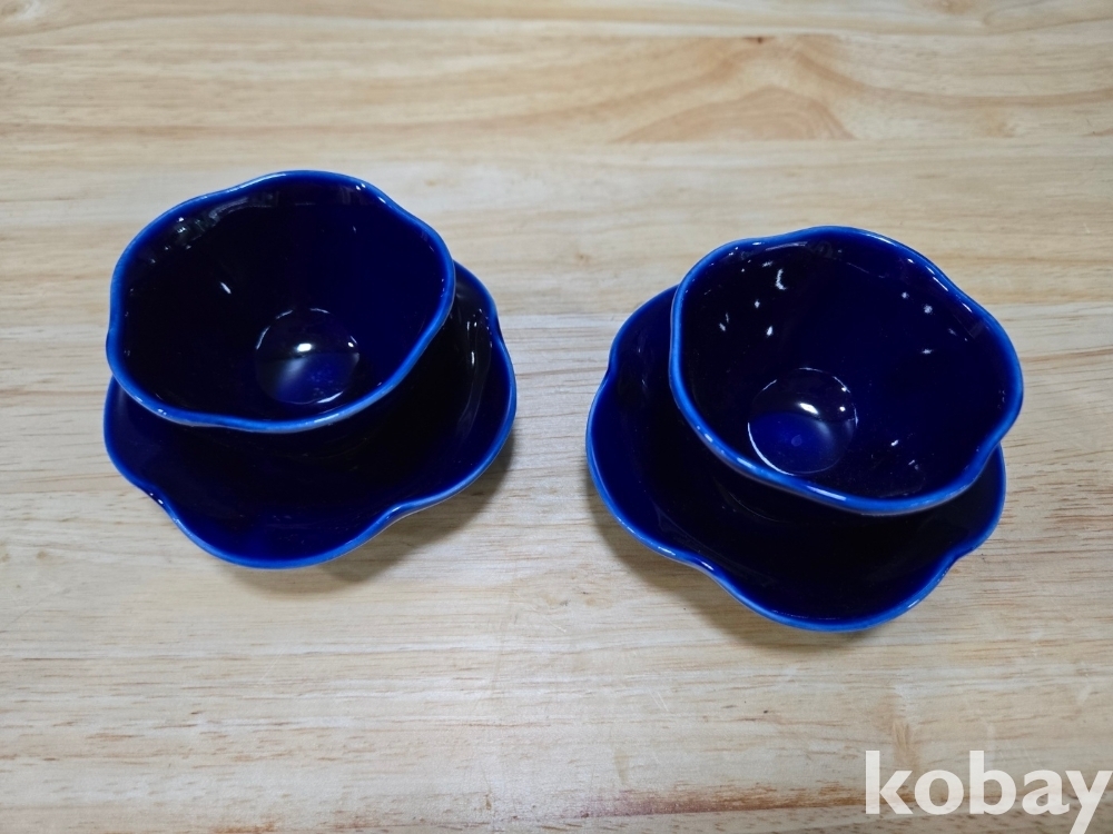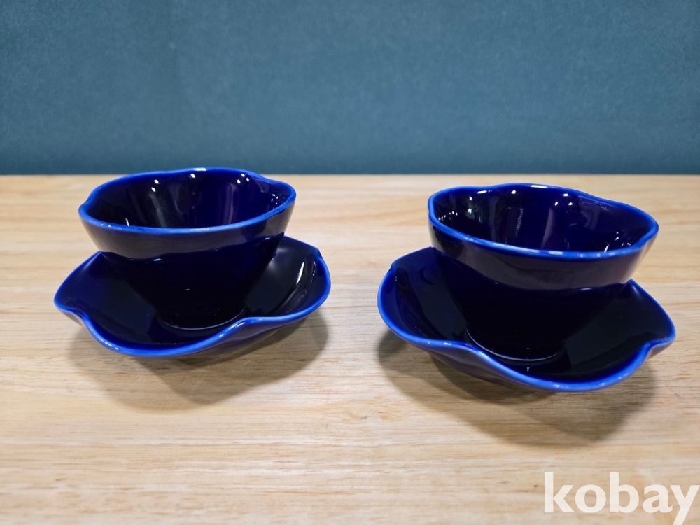색감이 아름다운 꽃 모양 잔 잔대 도자기 2점 입니다.