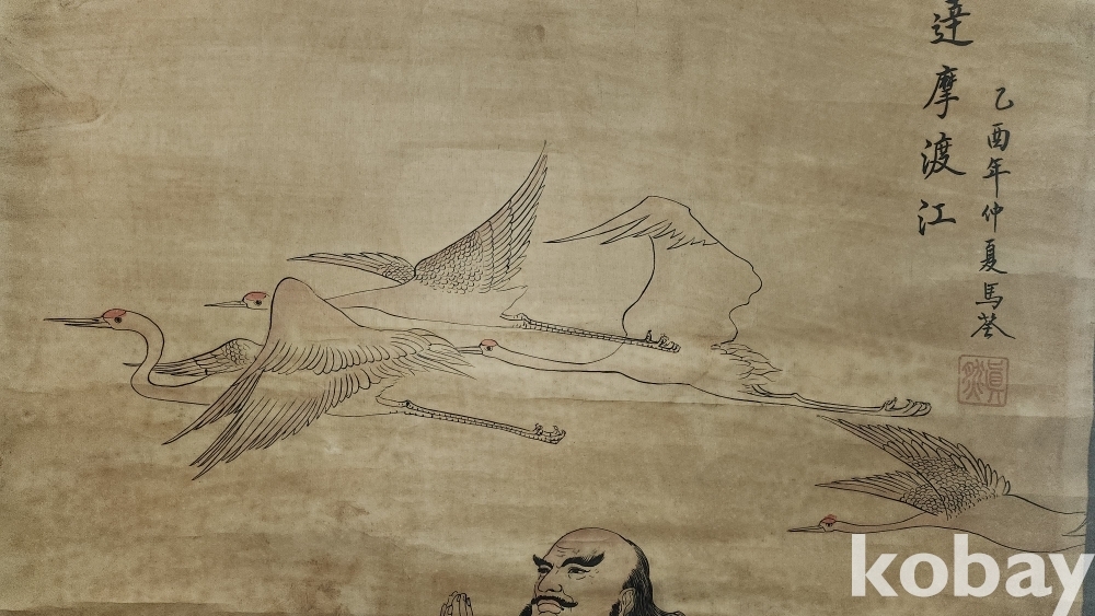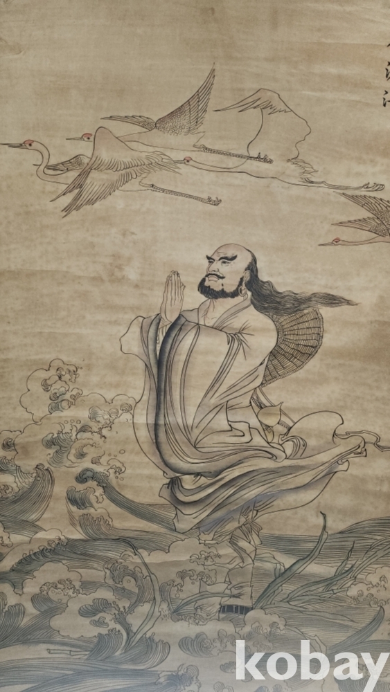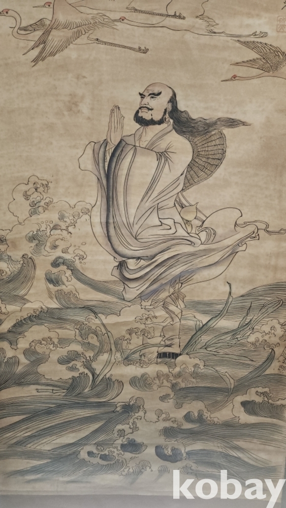 하늘에는 4 마리의 학이 날고 강에는 큰 물결이 넘실대는데 달마께서는 기어히 강을 건너겠다는 일념으로 두손 모아 합장하는 그림입니다,