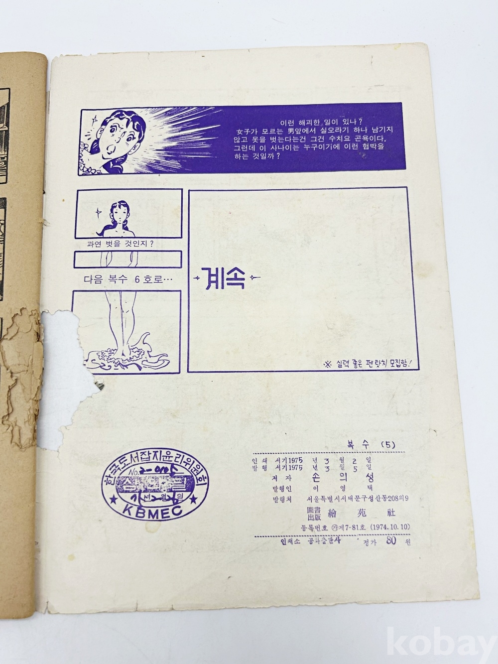 상품 설명 | 1975년 발행 손의성의 오리지날 성인극화 '복수' 5편이다. 총 50p. | ||