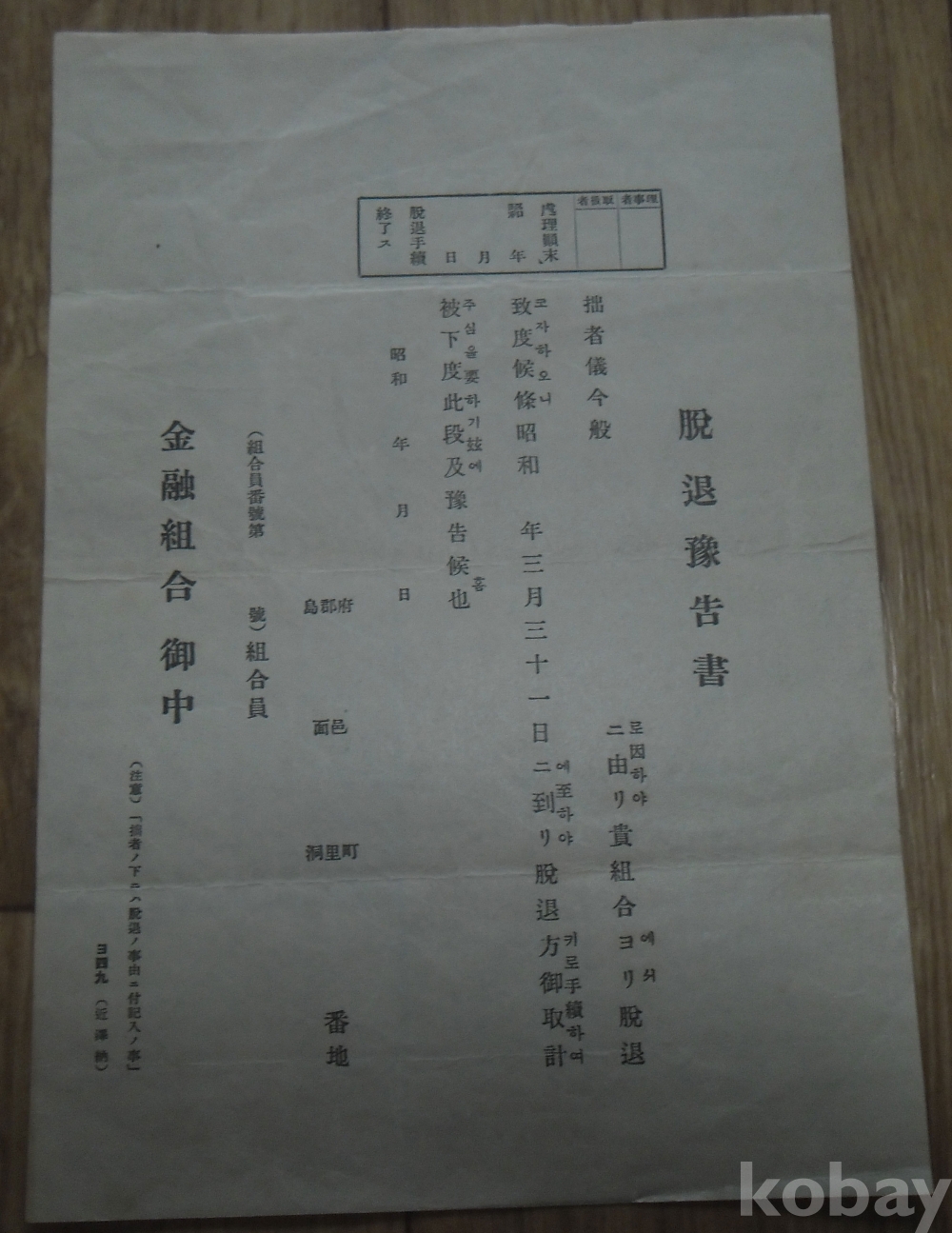 일제강점기 미사용 서식: 금융조합 탈퇴예고서