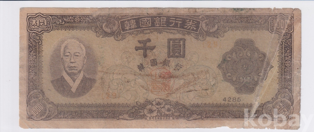 - 4285년(1952년) 좌이박 신 천원 사용제 지폐