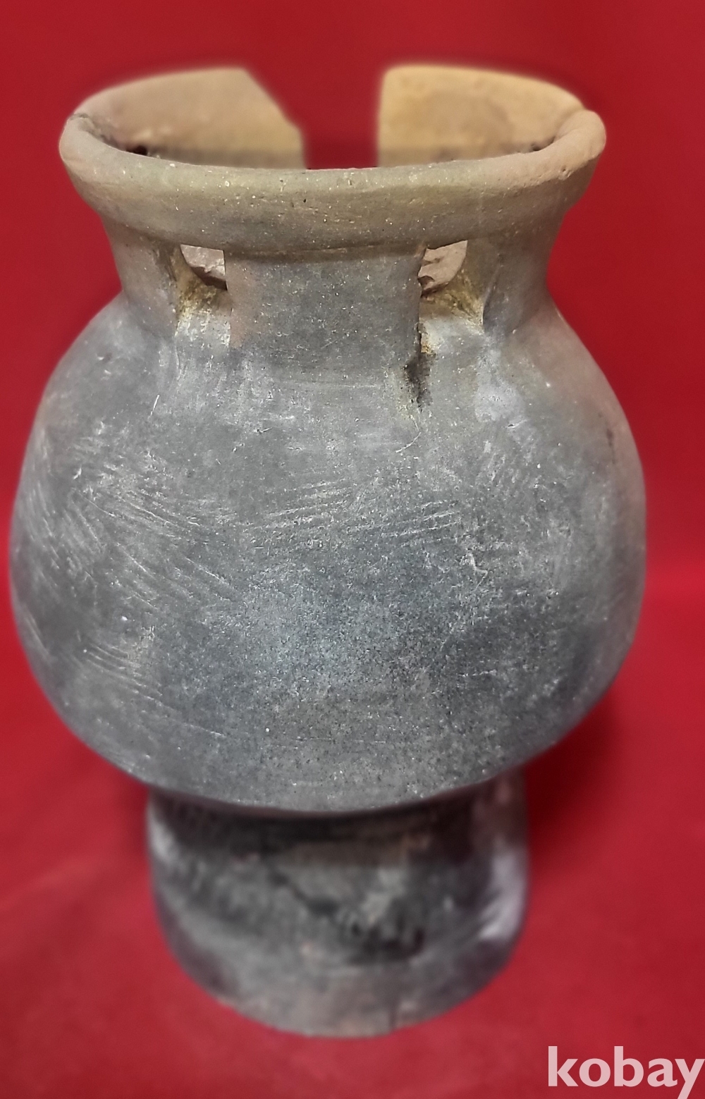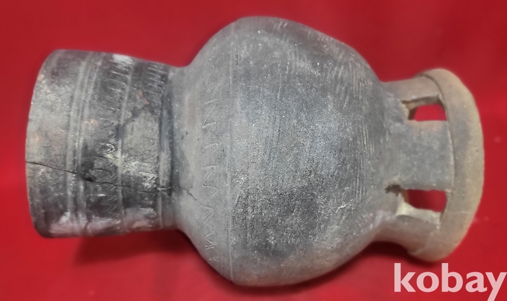 촘촘한 파상무늬 띠가 목부분 2군데 몸통부분 1군데 도자기 하단부 전체에 도안이 되어있습니다
