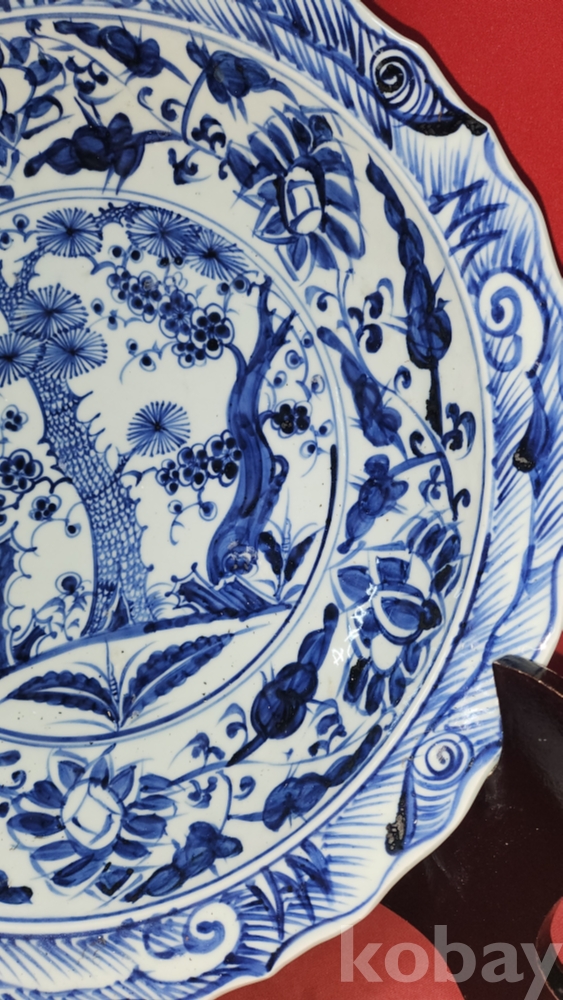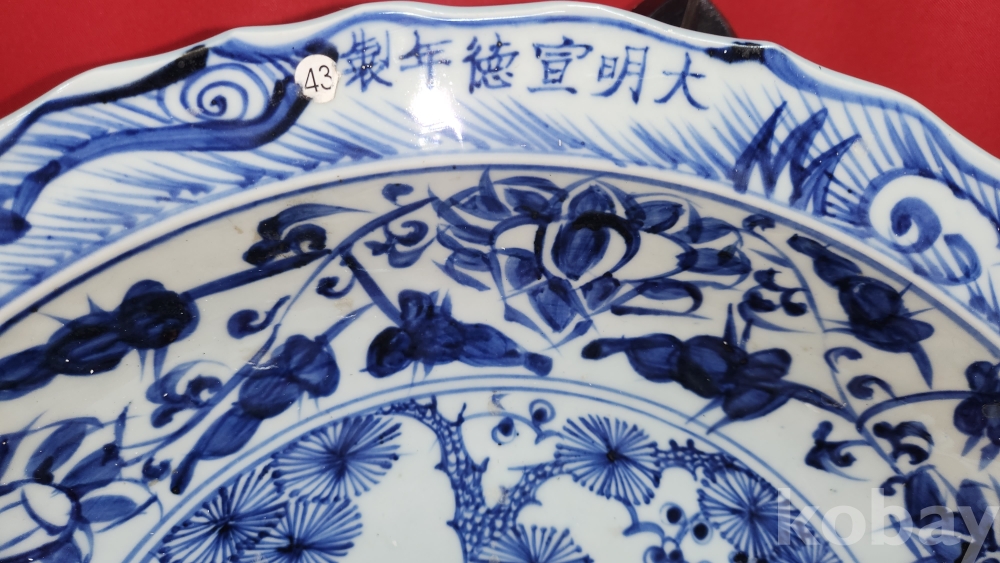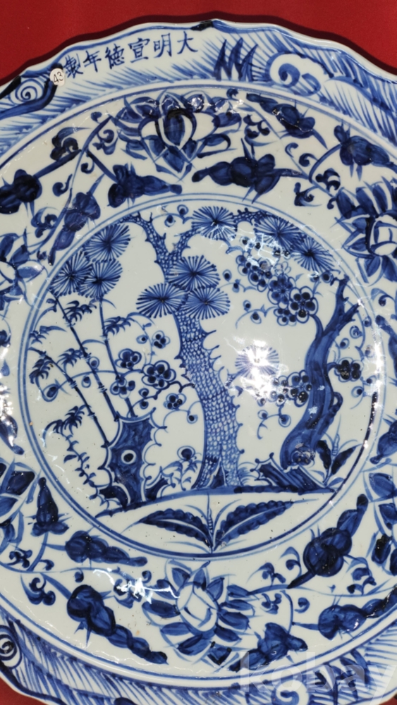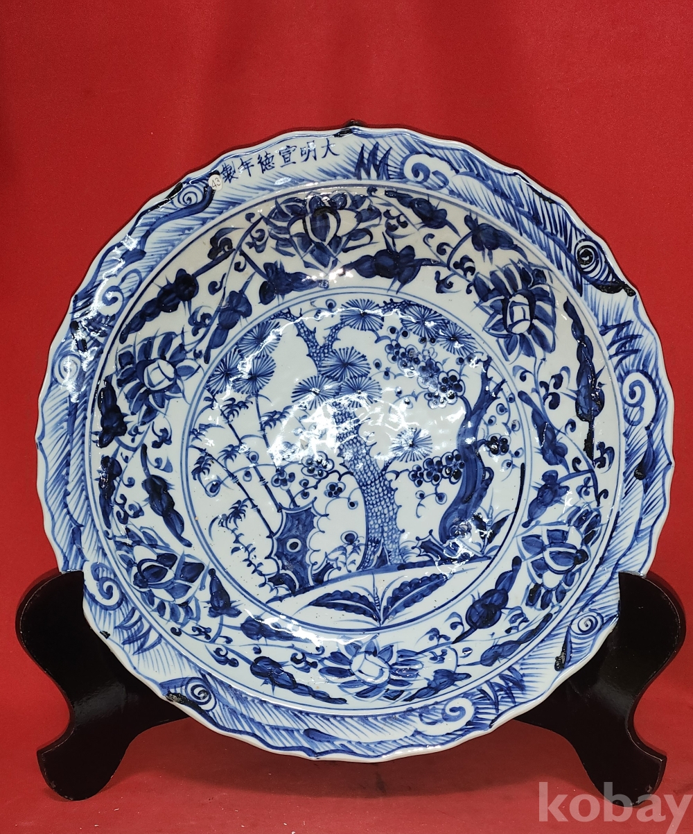 대명선덕연제 관지 노오출구공사(盧吳出口公司) 노근재(盧芹齋) 표기있는 소나무와 맹하(松梅)문양 화형 대반(大盤)입니다,