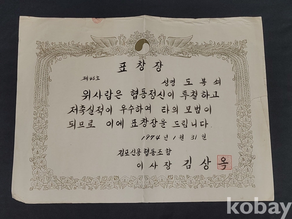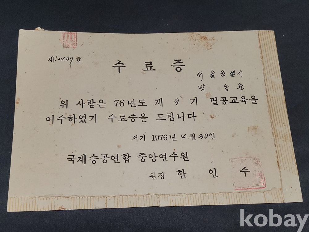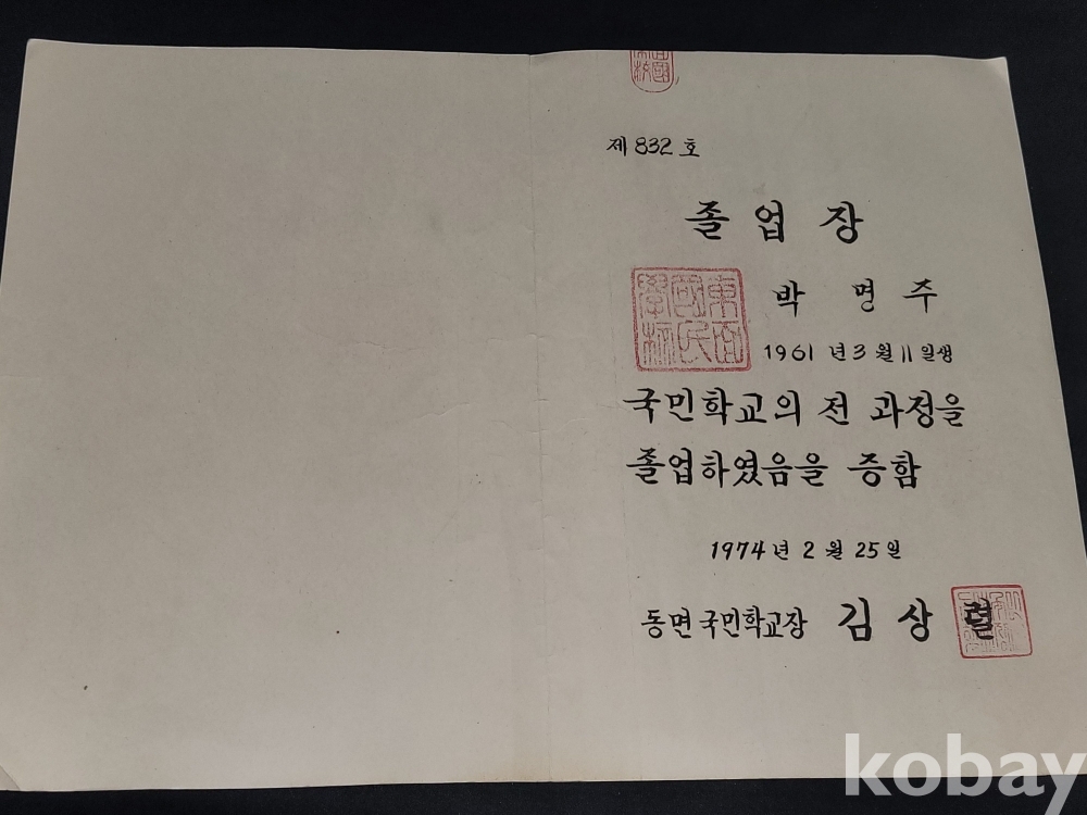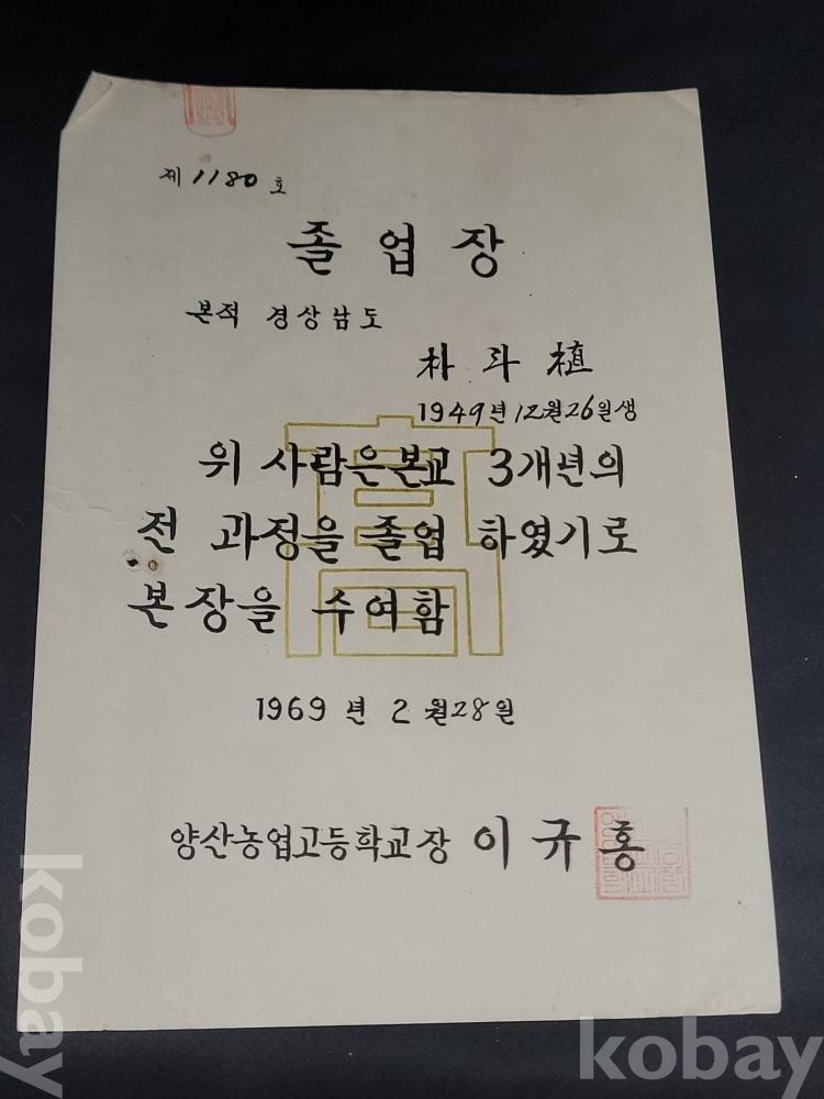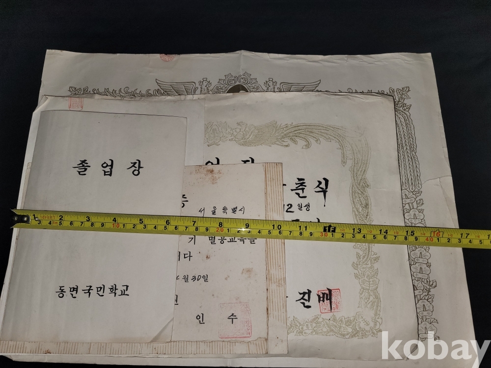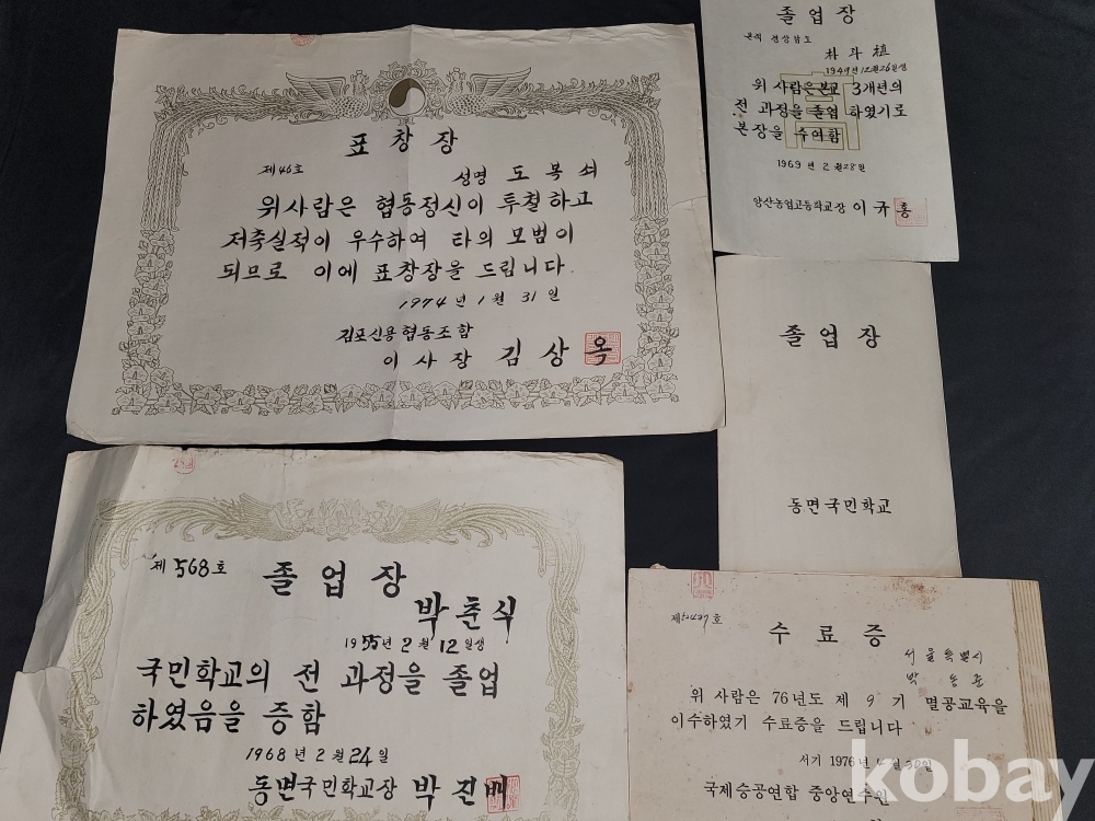 빈티지 세월 감이 느껴지는 1968년 동면국민학교 졸업장, 1969년 양산농업고등학교 졸업장, 1974년 동면국민학교 졸업장, 1976년 멸공교육 수료증