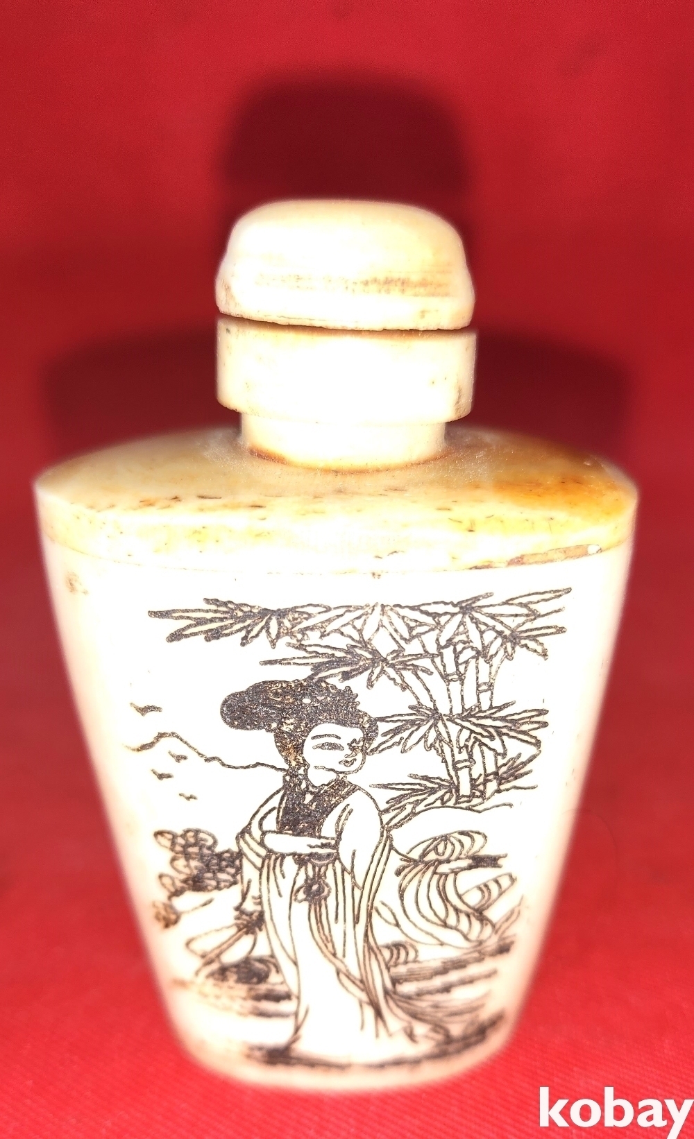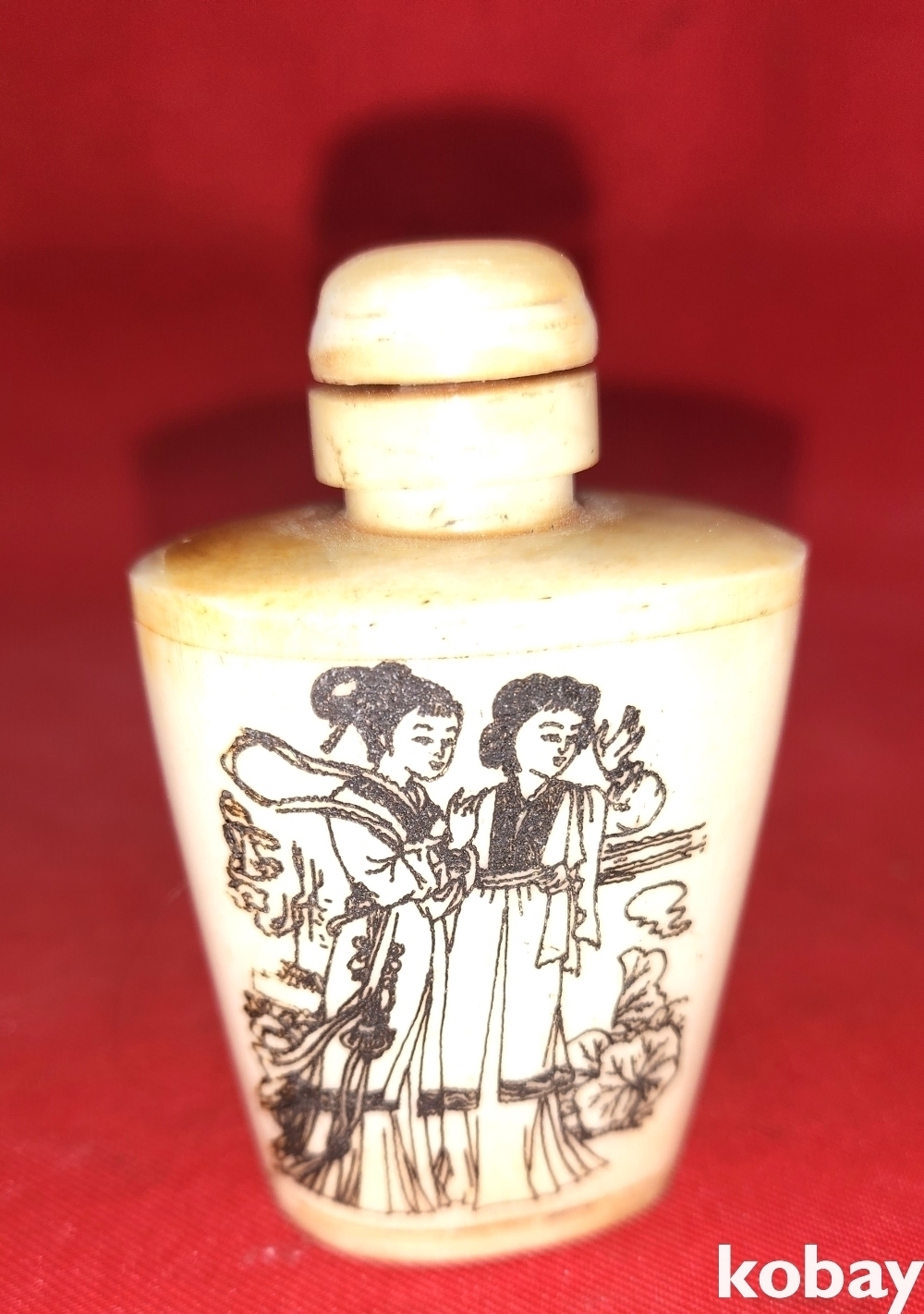 짱짱한 연대 갖춘 동물 뼈로 완성된 미인도 문양 비연호(鼻烟壶)입니다,
