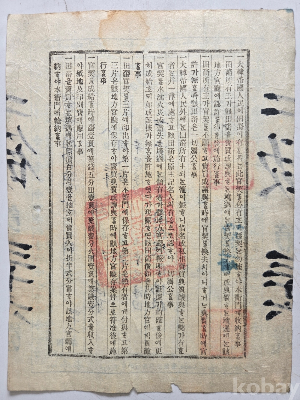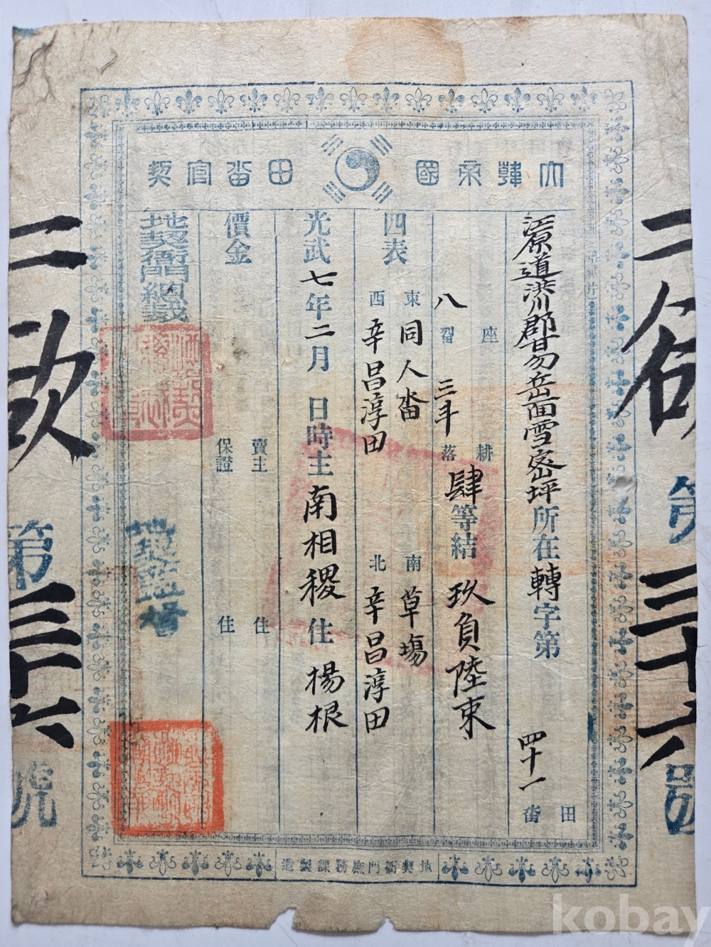 관계(官契)는 대한제국기 발급된 토지문서이다. 정부는 전국의 토지를 조사하기 위해 지계아문(地契衙門)을 설치하고 관계를 발급하였으나 주관부서가 여러 차례 바뀌고 지주들의 반발에 부딪쳐 조사가 전국적으로 실시되지는 못했다. 전답관계 양식은 조선시대의 토지대장[量案]과 토지매매문서의 중요 내용을 결합한 것이다. 즉 사표(四表;토지의 사방 경계)와 토지 등급은 토지대장에서 따온 것이며 매주(賣主)와 보증인의 이름과 주소 및 구입 당시의 토지 가격 등은 매매문서에서 따온 것이다. 가사(家舍) 관계도 있었는데 가사의 소재지, 가사 형태와 총 칸수, 소유주의 주소와 금액을 적도록 되어있다. 관계도 호적표와 마찬가지로 일정한 양식을 미리 인쇄하여 관계기록을 적도록 하였다. 그 뒷면에는 전답소유와 전답관계 등에 대한 8가지 규정이 소개되어 있는데 그 대강을 소개하면 다음과 같다. 토지소유자는 이 관계를 반드시 지녀야 하며, 매매 양도시에도 관계를 사용한다는 것, 외국인에게는 토지소유 권한이 없다는 것 등이다. 관계의 작성과 보관, 유실시 대처 방법 및 관계 발급시 비용 등에 대해서도 밝혀져 있다. 국한문혼용으로 인쇄하였다.