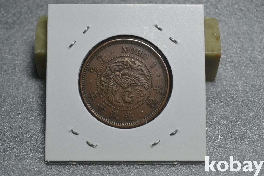 " 매우 귀한 최상급 보존상태~ 극미품 이상~ 준미사용품~ ".. " 귀한 대형 광무10년 봉황도안 1전 청동화 "~ 진품~ 조선말 구한국 근대전 / 광무10년(1906년) 대형 1전 청동화 / 귀한 대형 일전종류 ~