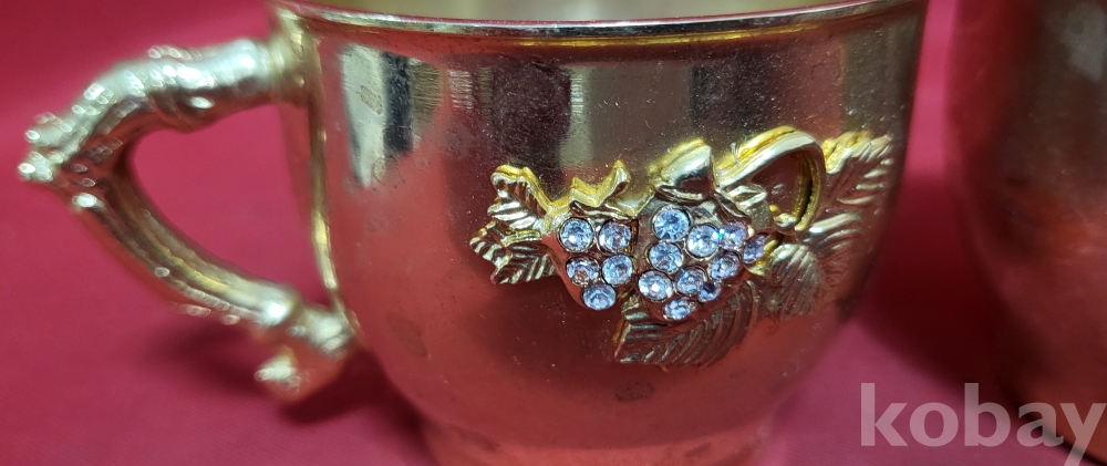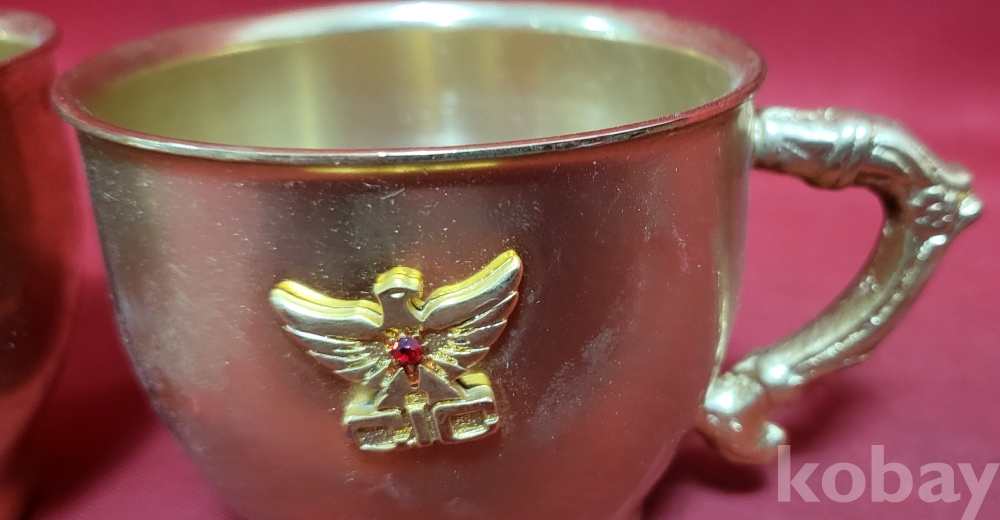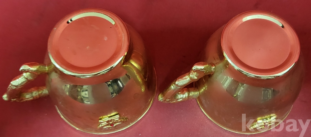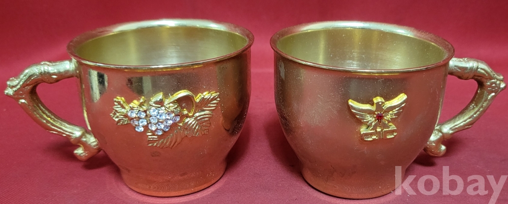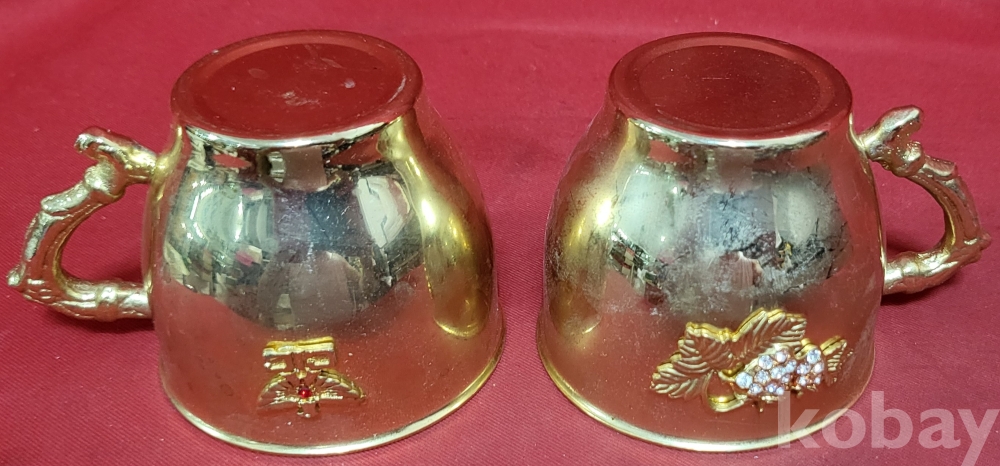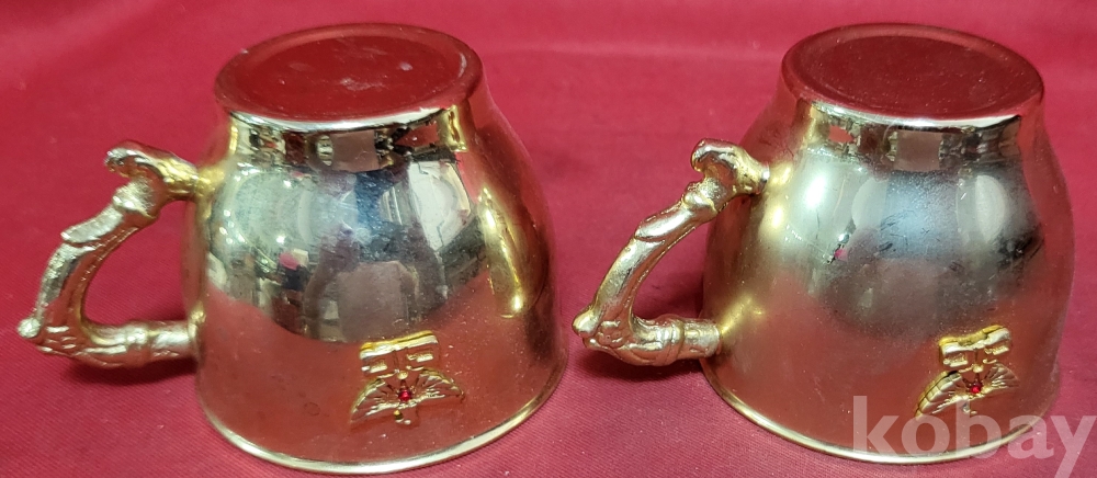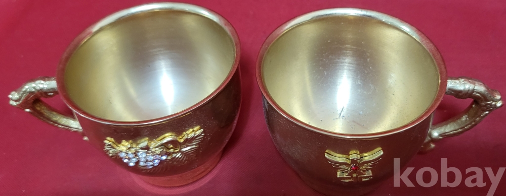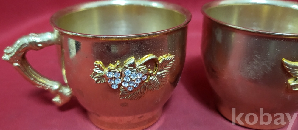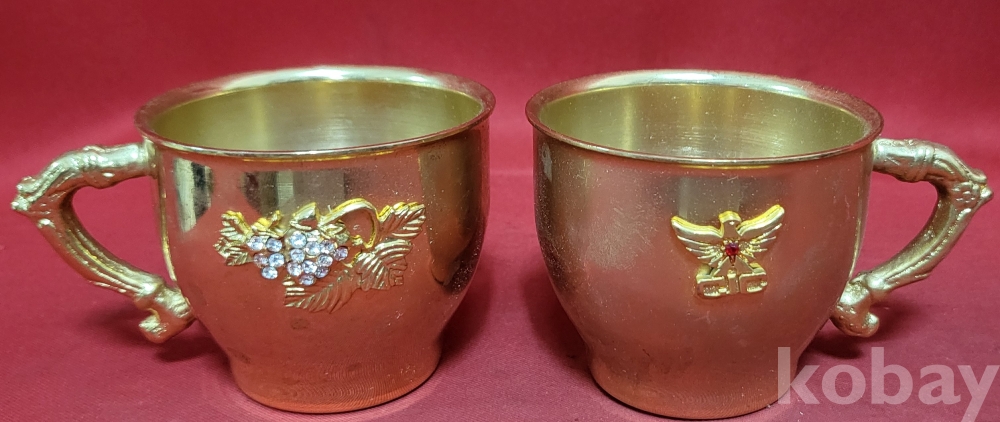 좌석에는 무반응하는 미사용 금색 잔 두개입니다,