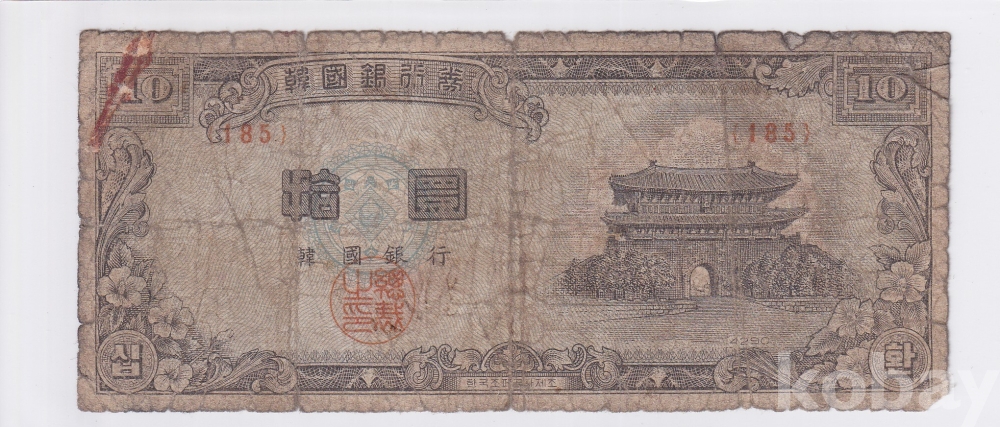 - 4290년(1957년) 남대문 신 십환 백색지 판번호 185번 사용제 지폐
