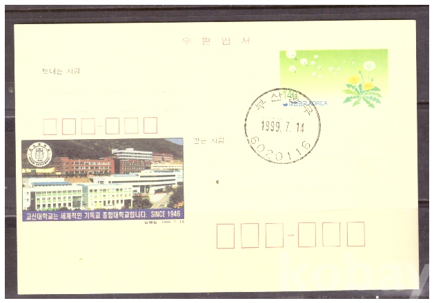 (광고엽서) 1999.7.14 지방판 LAPC315 고신대학교 (민들레 140원) (초일일부인)