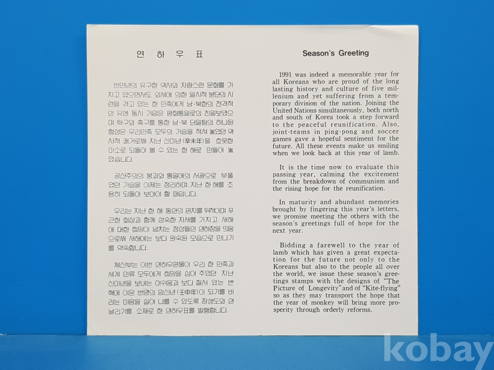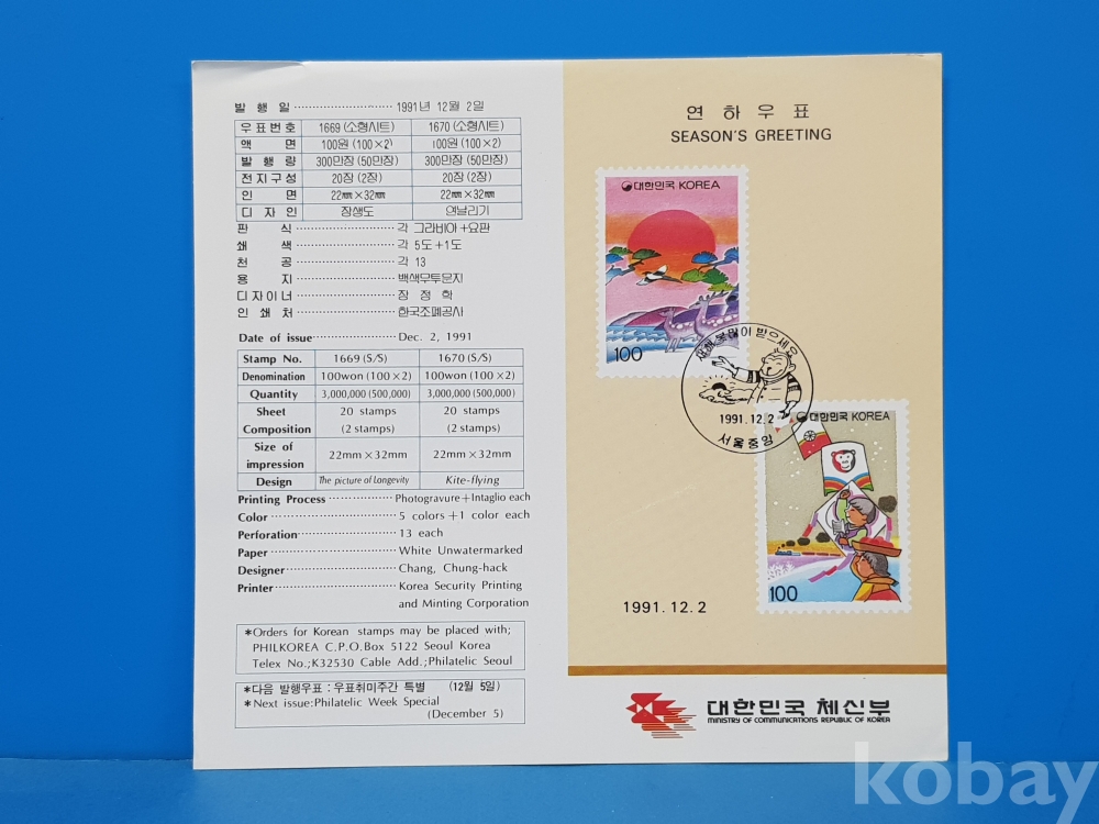 **** 연하우표/1991.12.2/대한민국 체신부*색 변함, 찢김, 접힘 등 있을 수 있음