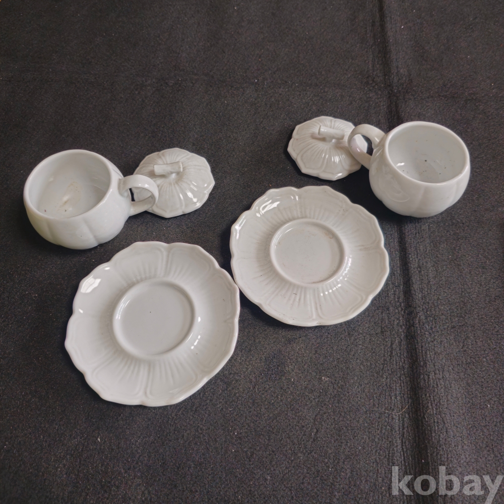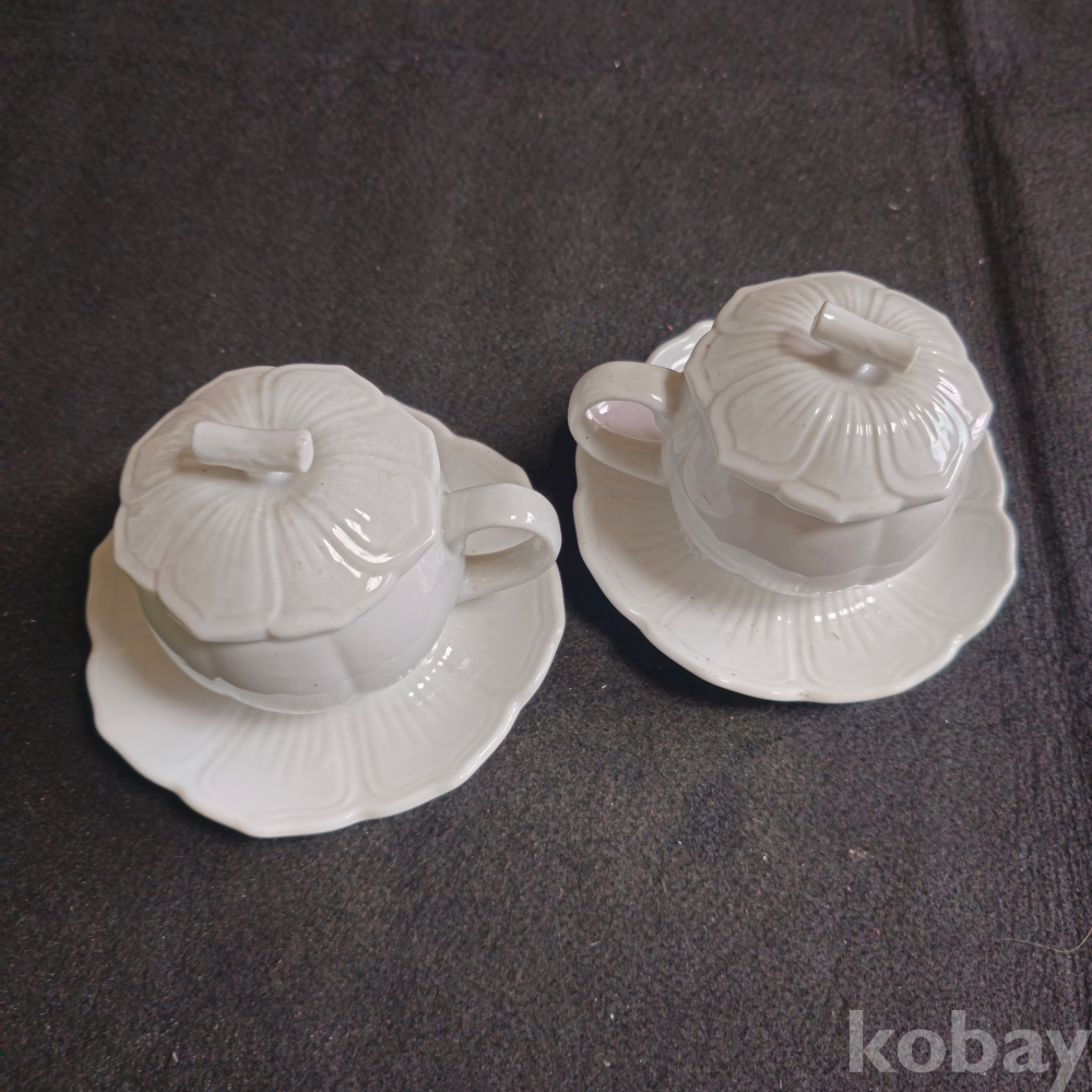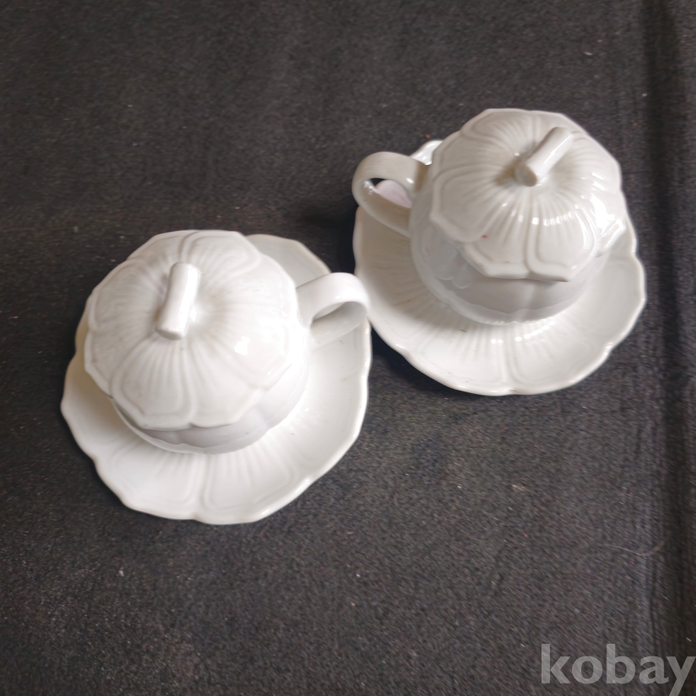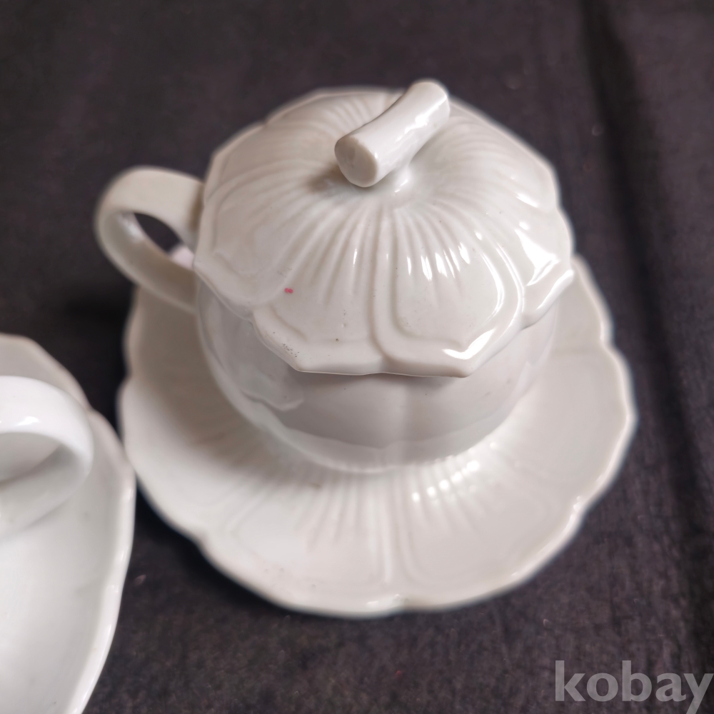 (((근현대사자료))) 오래전 바닥각인있는 연꽃모습 커플 도자기 찻잔/잔받침