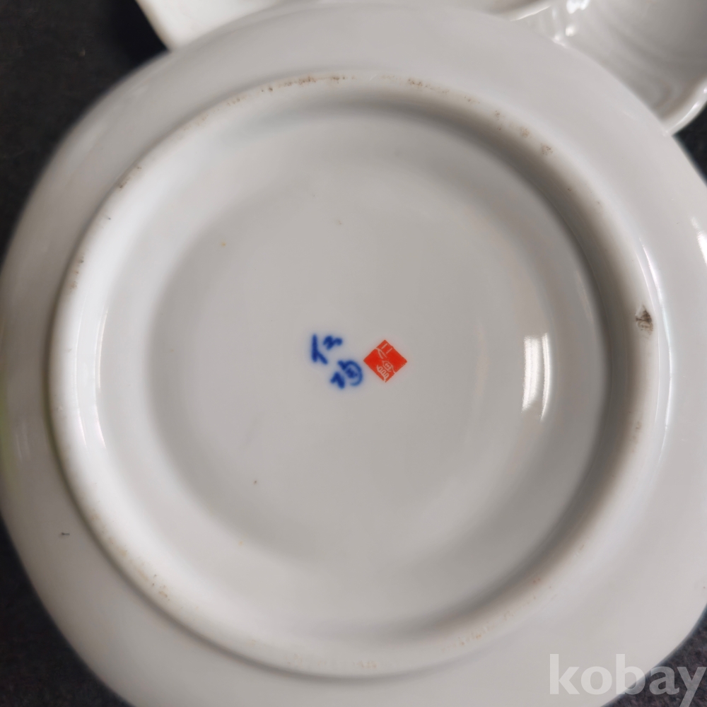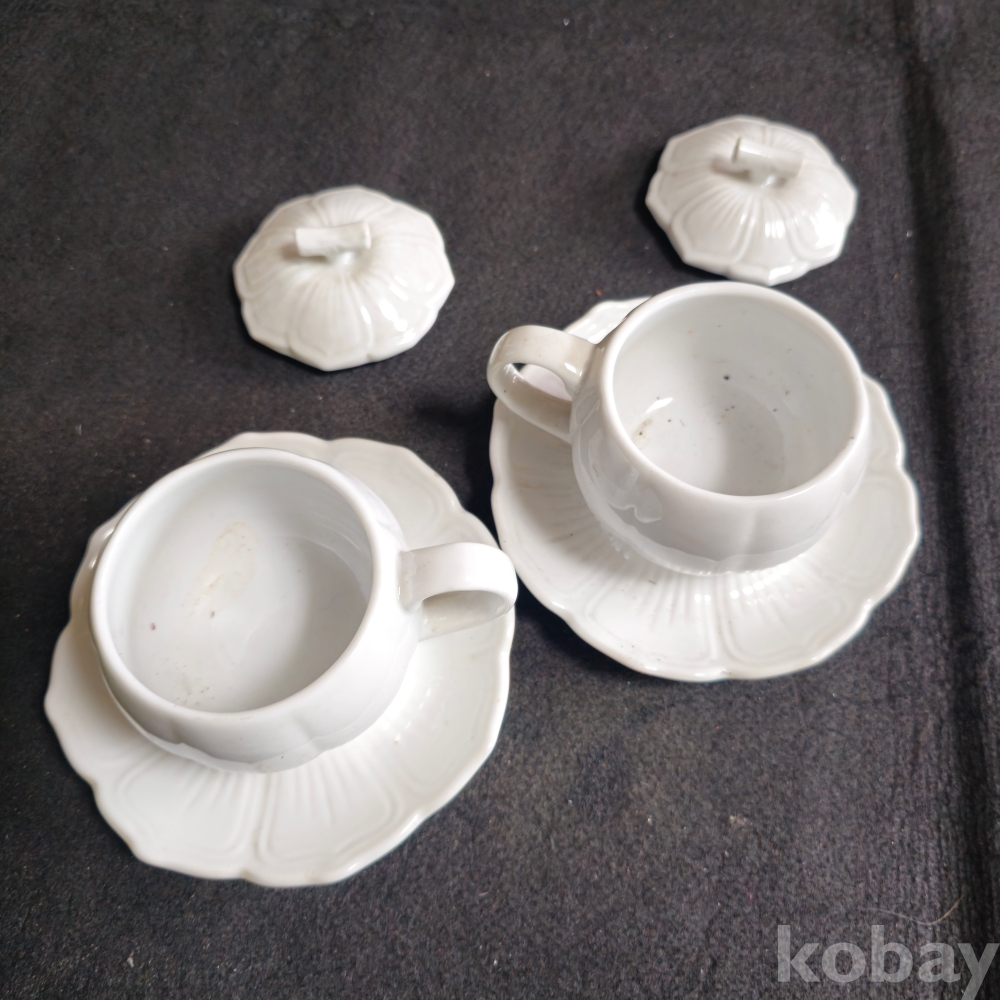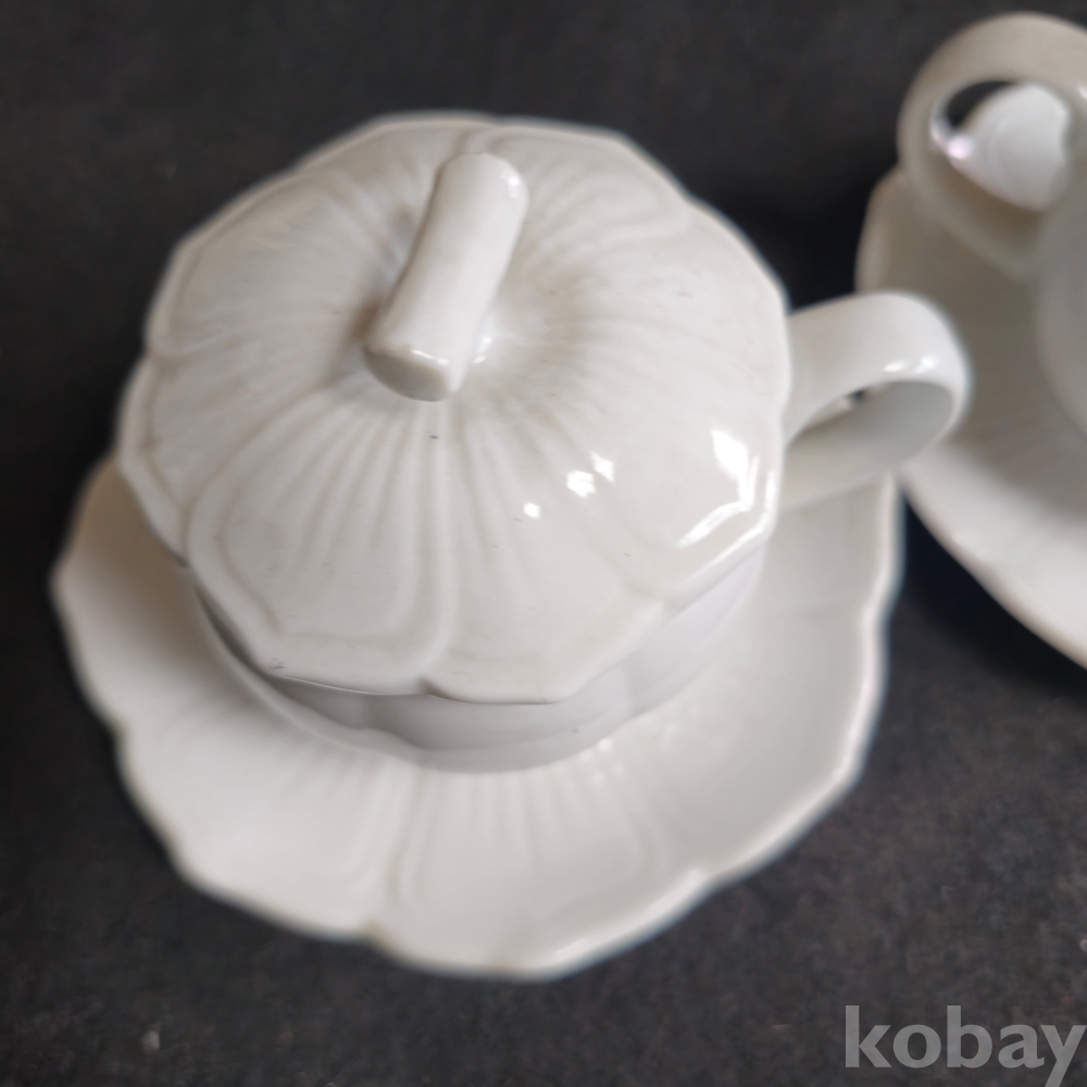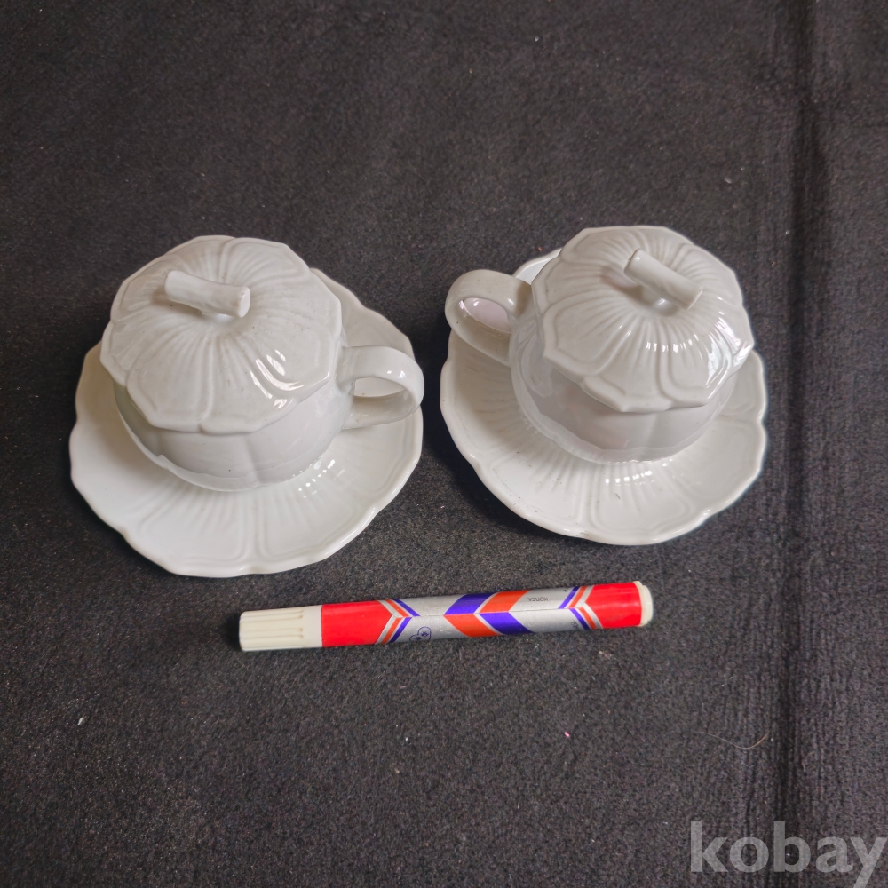 (((근현대사자료))) 오래전 바닥각인있는 연꽃모습 커플 도자기 찻잔/잔받침