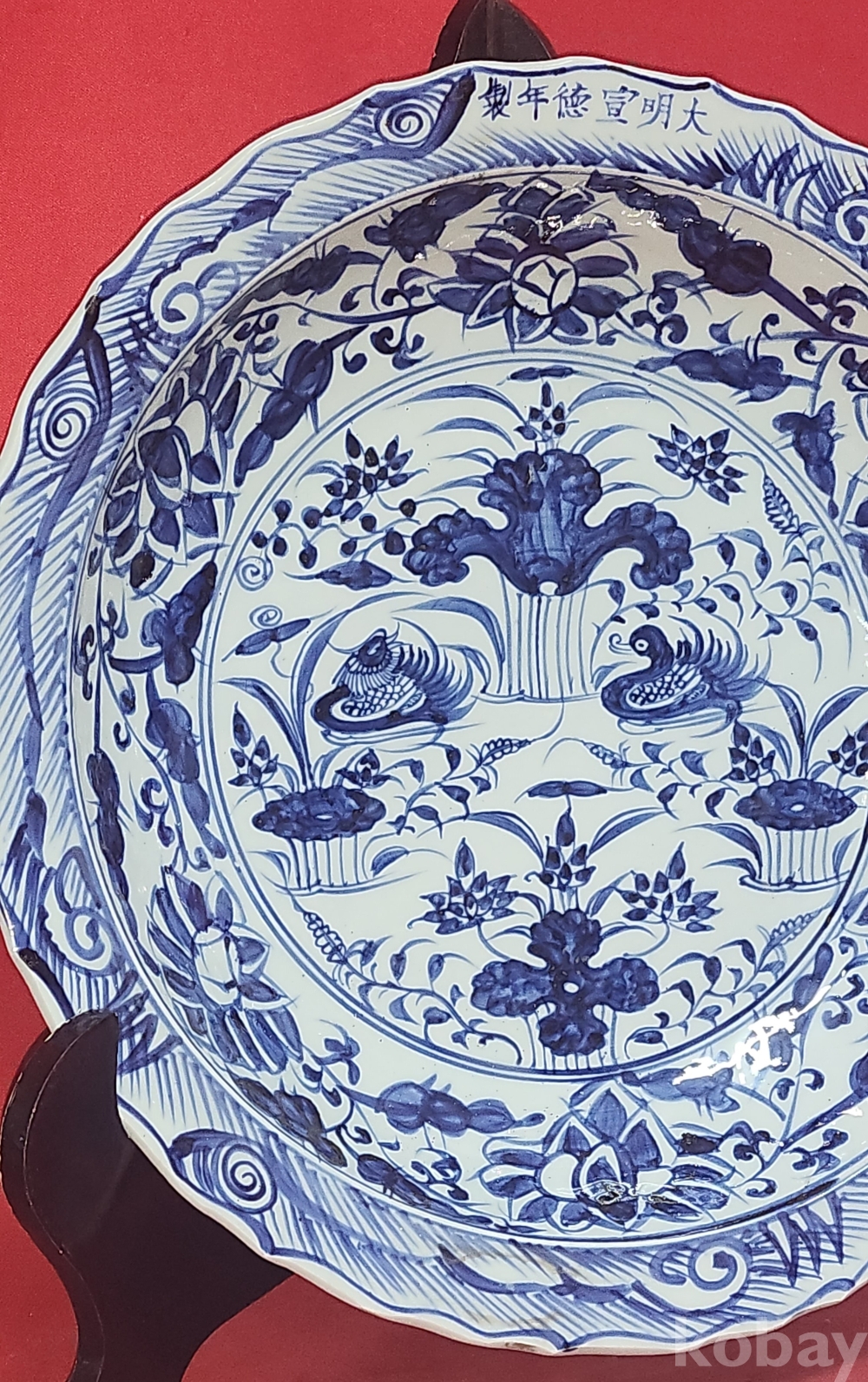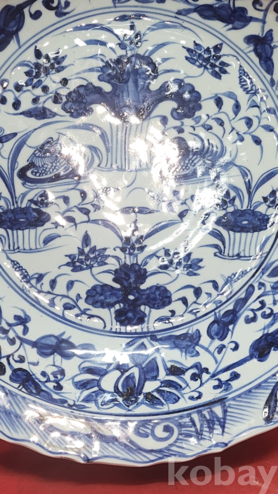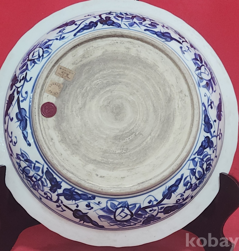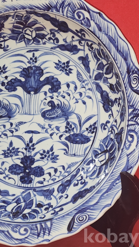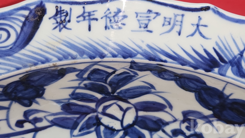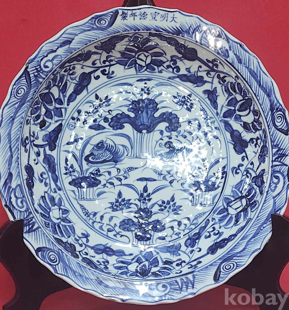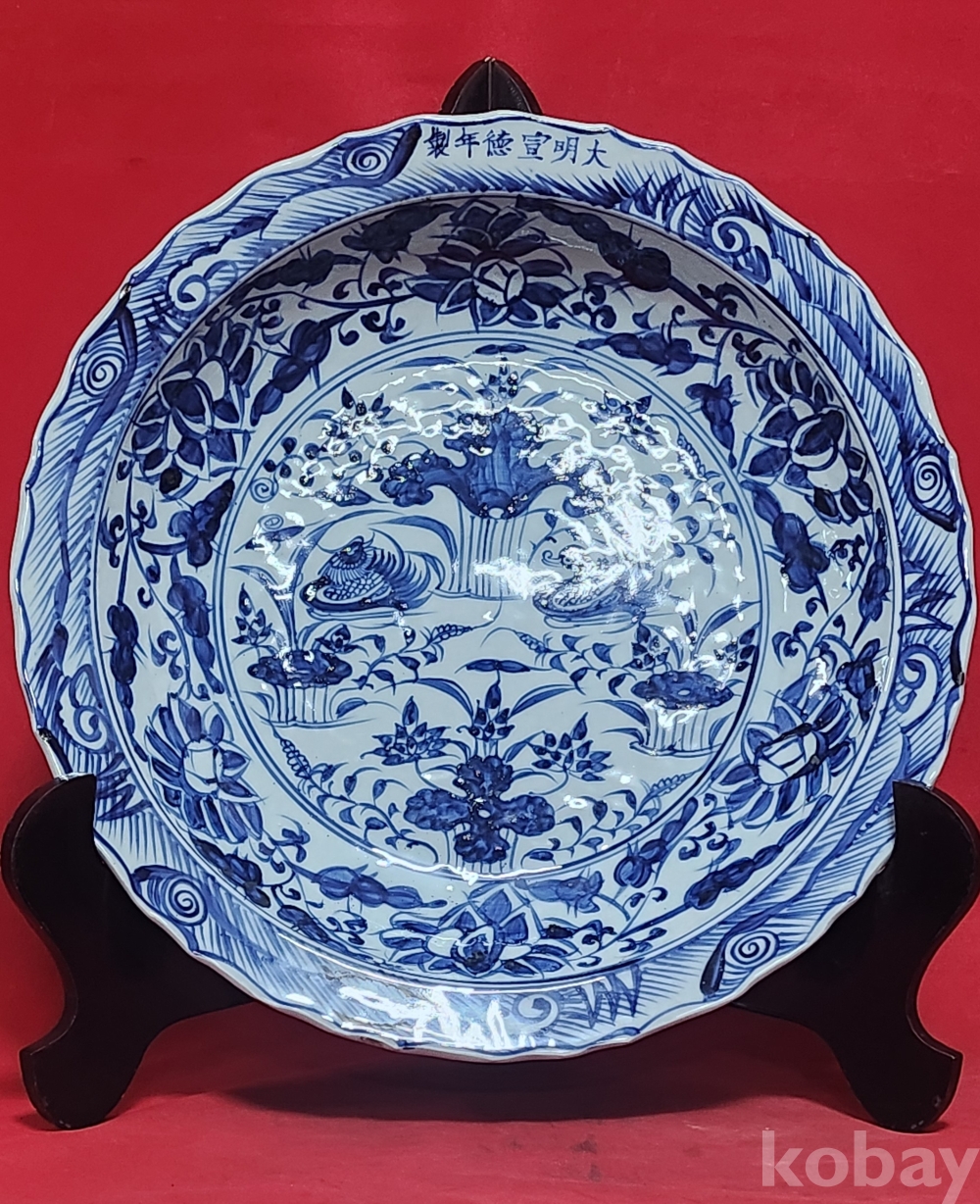대명선덕연제 관지 노오출구공사 1921년 표기가 보이는 청화백자 연꽃과 원앙문양 화형 대형급 소반 (小盤) 입니다,