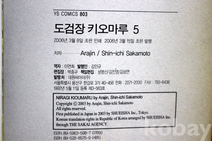 (만화) 도검장 키오마루 5권 완질 - 아라진 글. 신이치 사카모토 그림 / 2006년. 대원 씨아이 발행