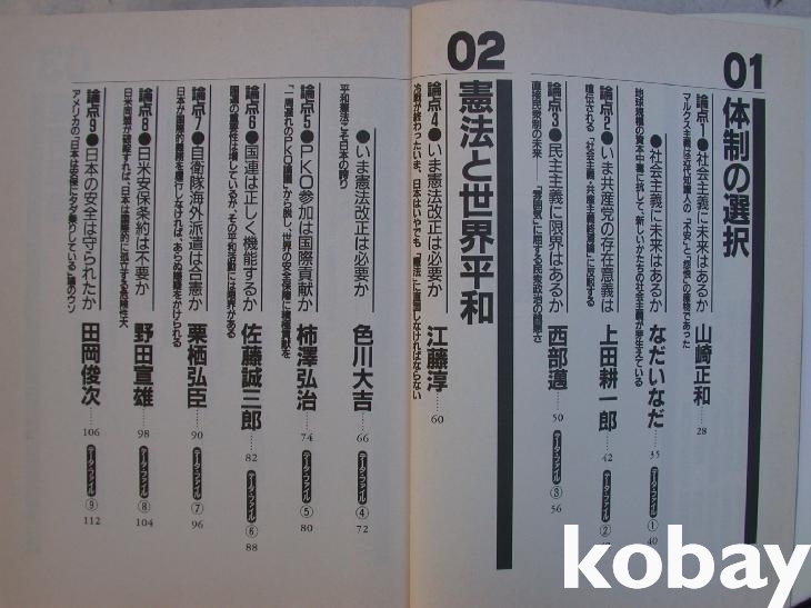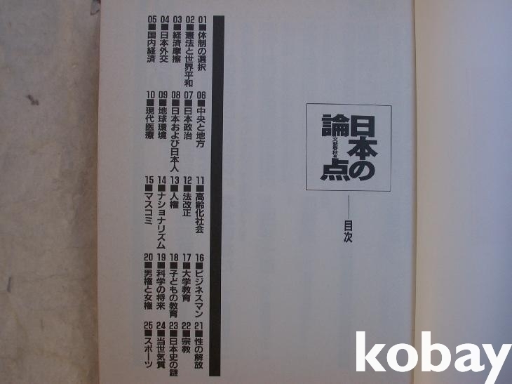 내표지에 한국인의 증정사인이 있다. 머리말은 없으며 바로 25가지 대항목 논점이 나오고 이어서 그 항목별 상세 논점의 목차가 있다. 모두 121개 논점이며 한 논점에 2논문이 실린 것도 있다. 그 뒤에 <본서를 읽는 법> 설명이 나온다. 가치관이 크게 변하는 금일, 금후 일본사회가 나갈 방향에 대해 큰 항목의 주제를 정하고 그에 따른 논쟁의 제1인자를 택해 그 당사자의 지론을 집필토록하였으며, 뒤에 편집부의 '데이터 파일'을 붙였고 본문에도 각주를 달았다고 하였다.