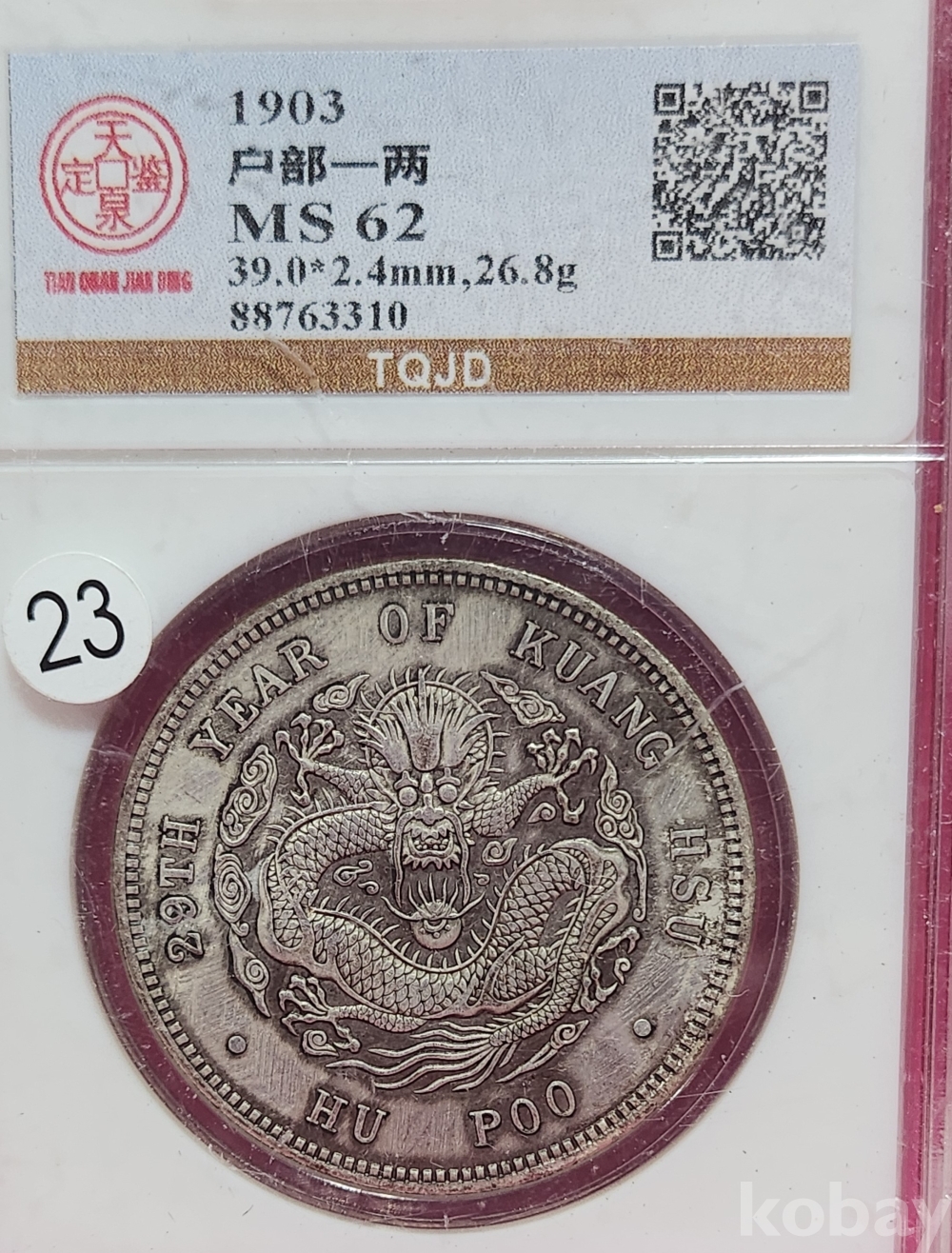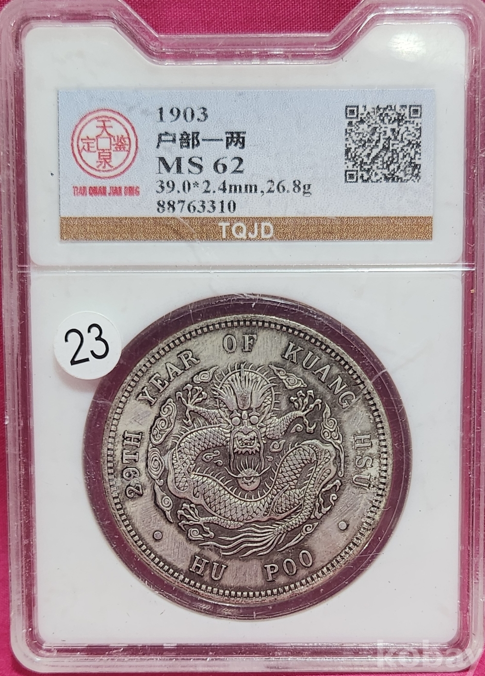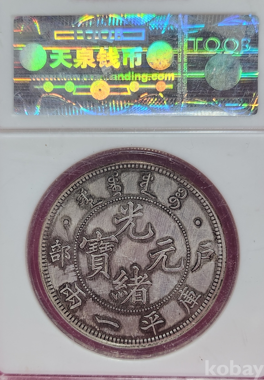 1903년 큐알코드(QR CODE)가 함께하는 은색 광서원보 (光緒元寶) 화패로 밀봉된 상태입니다,
