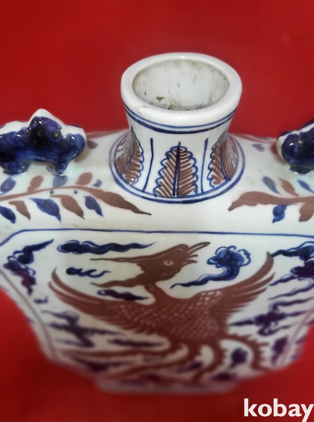 대원국지정팔년제 청화 유리홍( 靑花 釉里红) 구름과 봉황(雲鳳) 문양 양이(兩耳) 편병입니다,