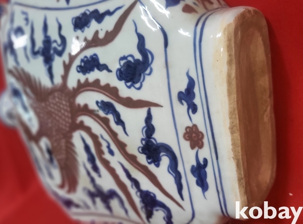 모든 구름은 청화이며 봉황 그리고 측면의 화훼문양은 유리홍으로 완성된 기물입니다,