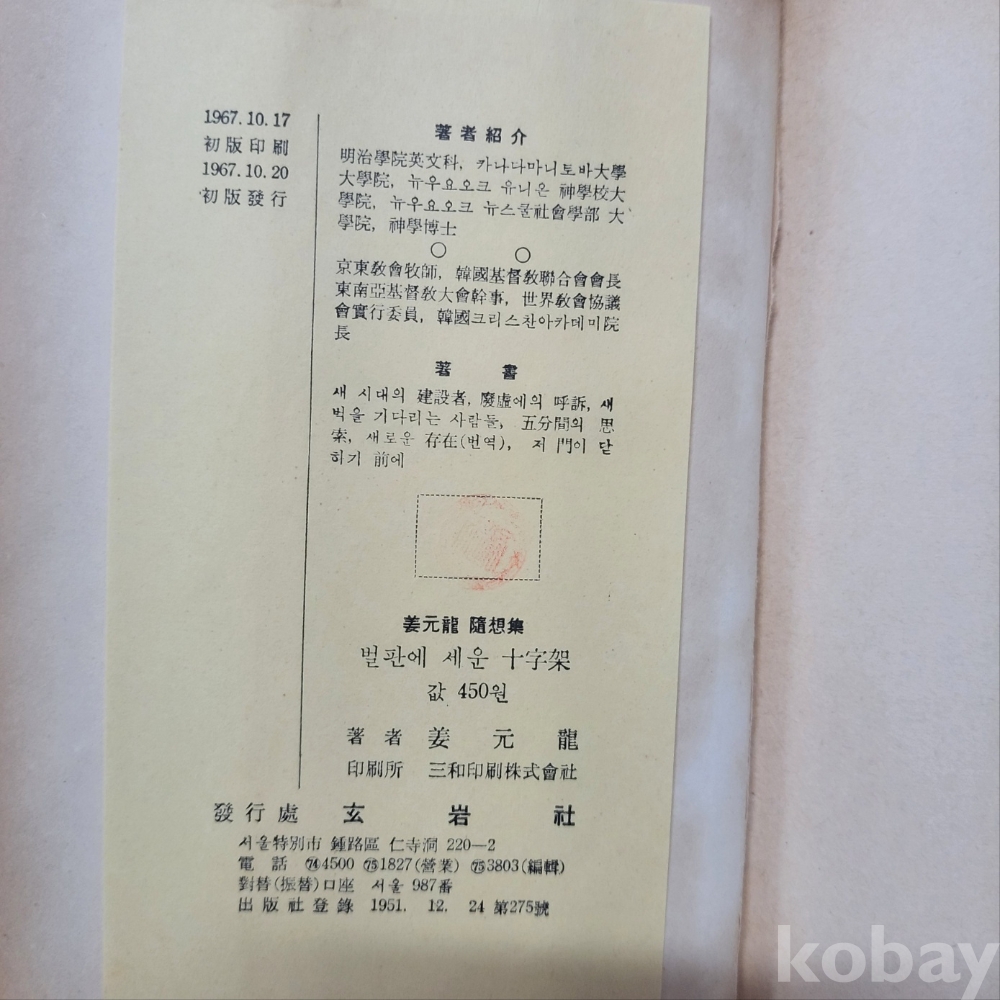 [희귀본] 벌판에 세운 십자가 (강원용 수상집, 현암사 1967년 초판본) ; 많은 입찰 바랍니다.