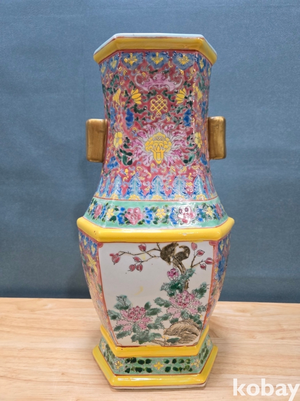 화려한 색감에 꽃과 새 표현 6각 양이 도자기 입니다.