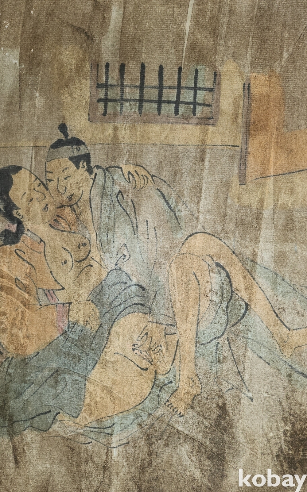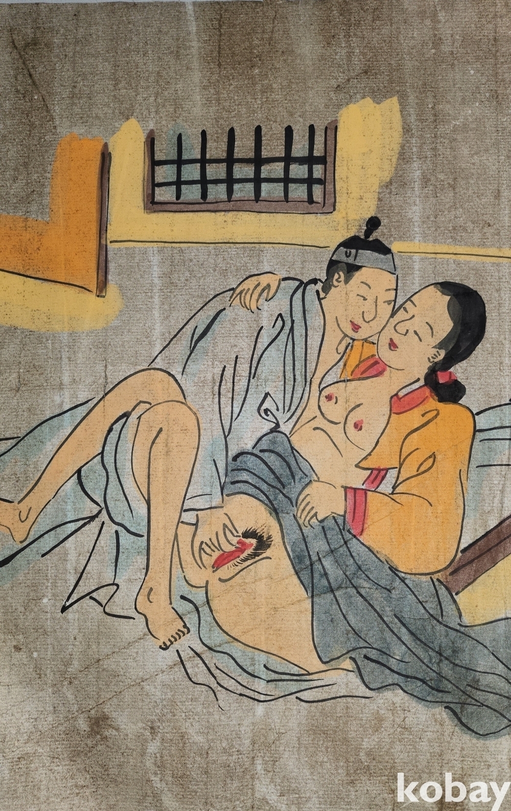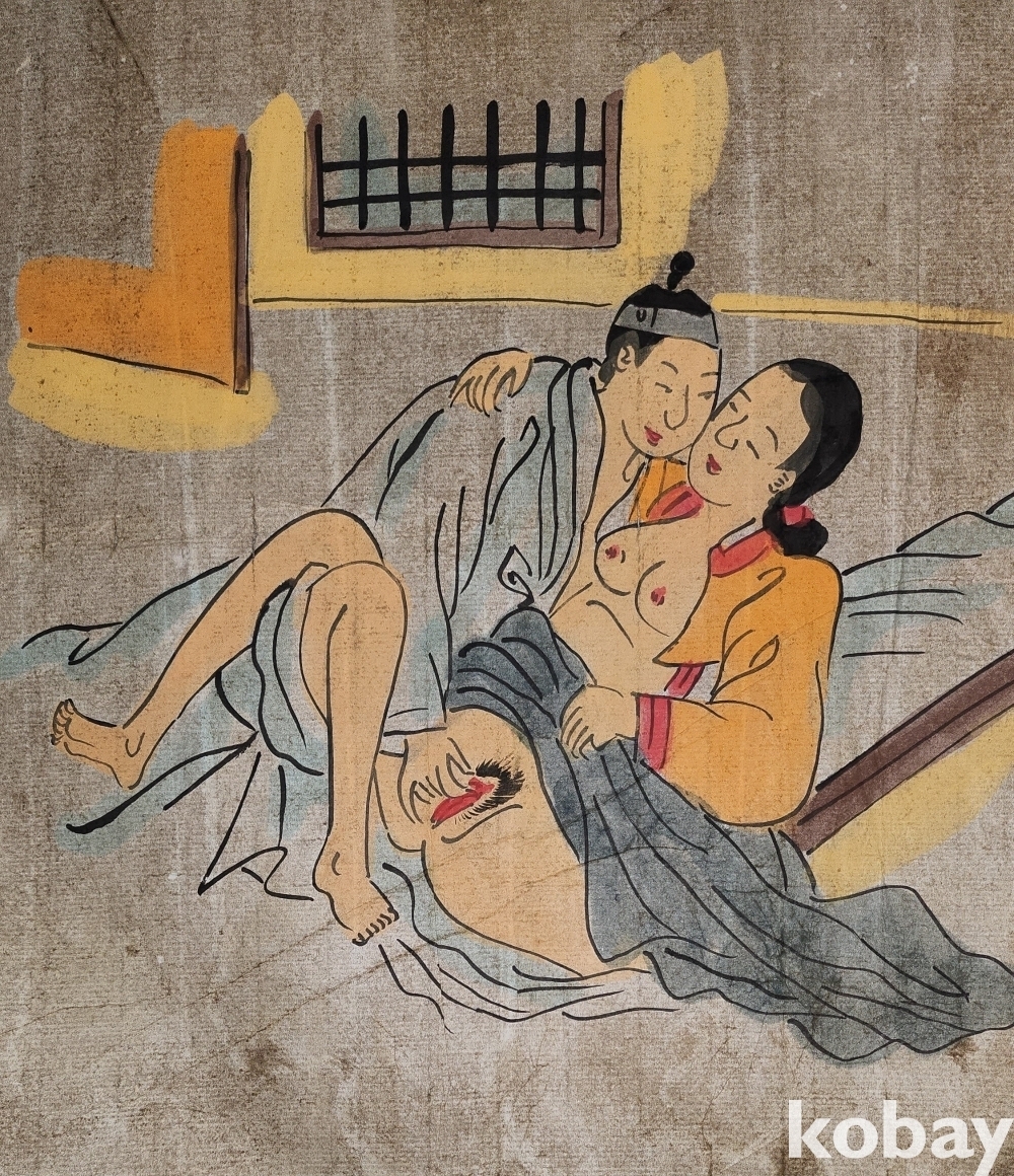 종이에 채색된 남녀 애정 행각을 표출한 그림입니다,