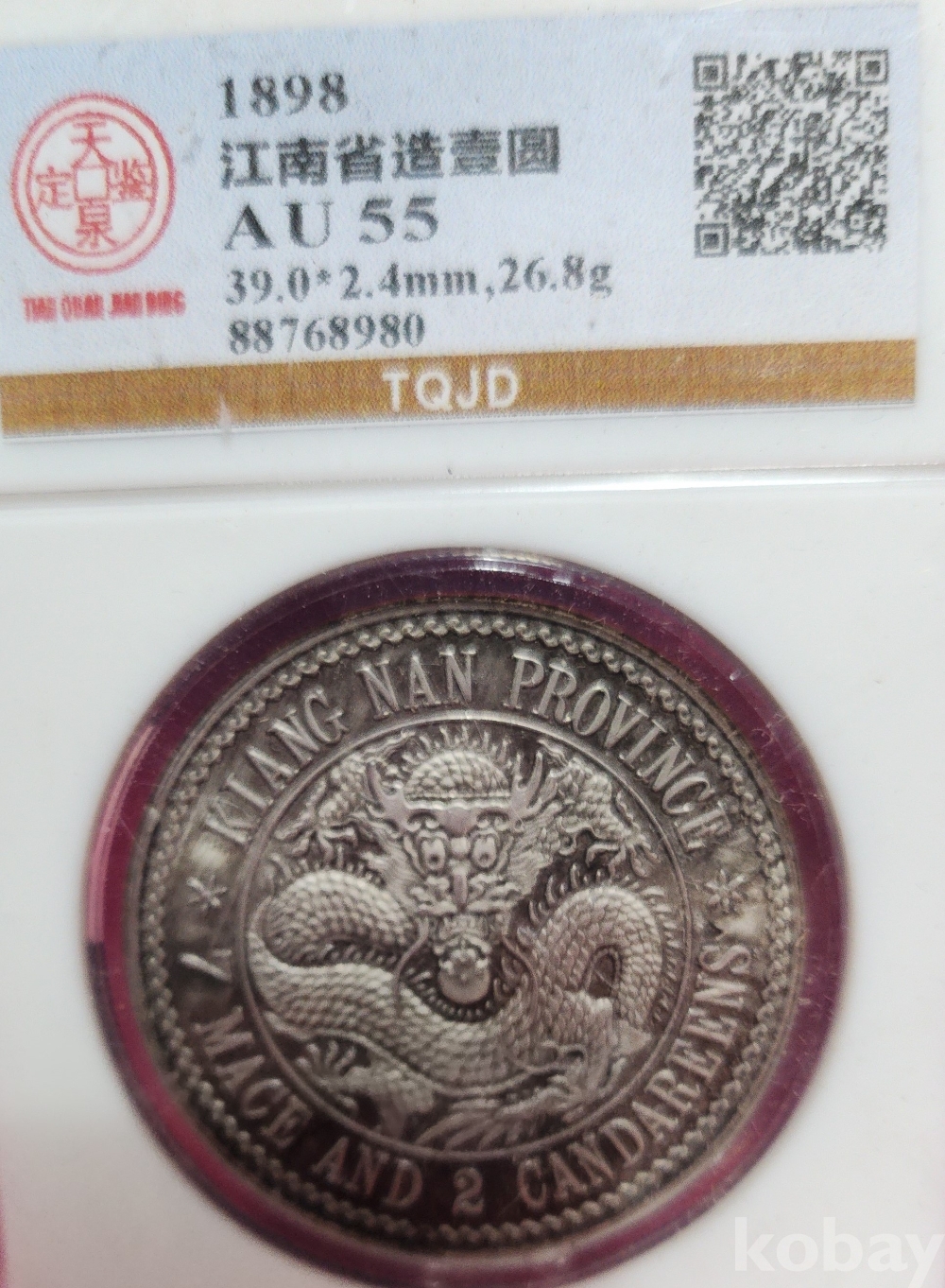 1898년  큐알코드(QR CODE)가 함께하는 은색  광서원보 (光緖元寶)' 화패로 밀봉된 상태입니다,