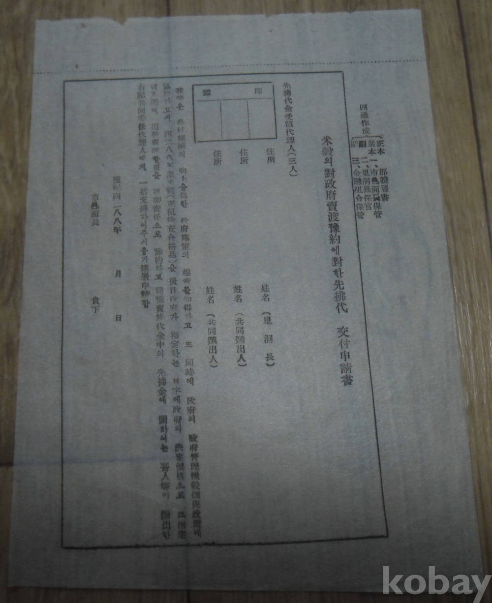 미사용 서식: 1955년 미곡의 매도예약에 대한 선불대 교부신청서