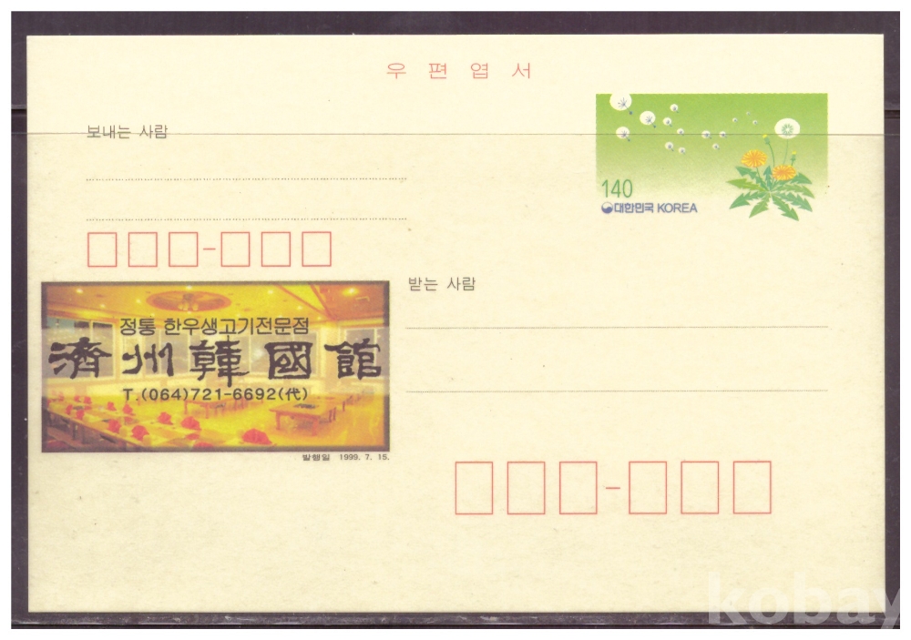 (광고엽서) 1999.7.15 지방판 LAPC318 제주한국관 (민들레 140원)