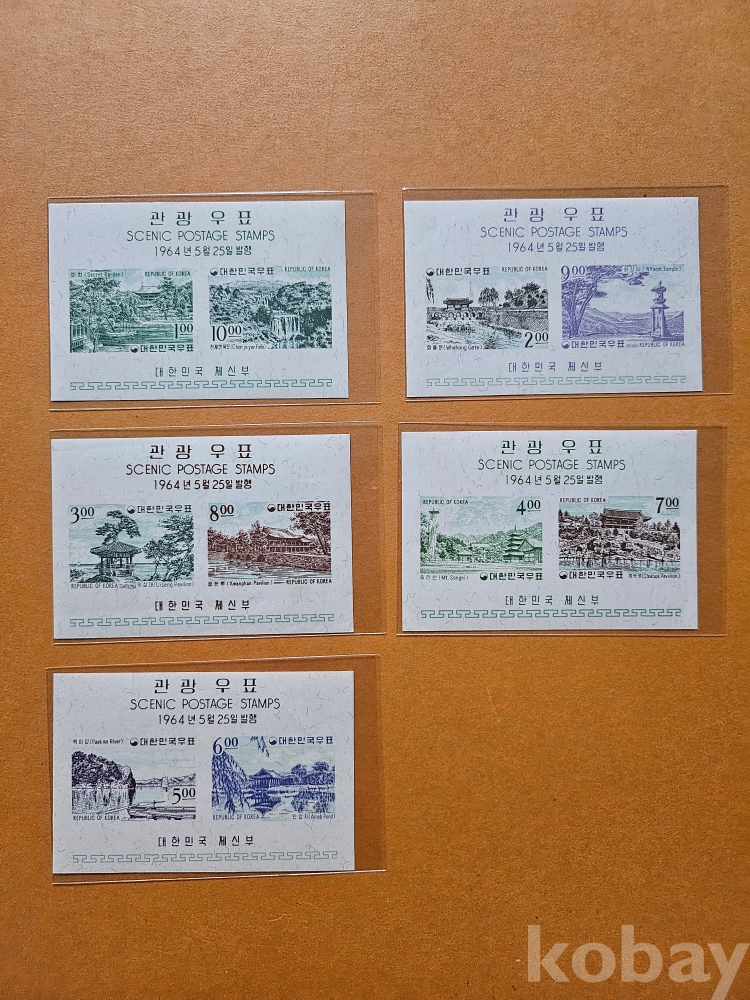 제1차 관광우표 시트 5종입니다. 일무 약한 기계주름이 있지만 힌지 없이 상태 좋습니다