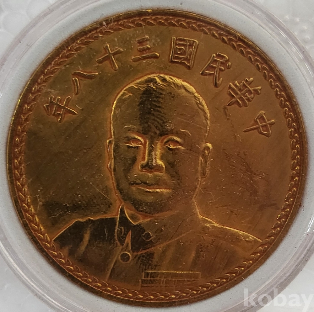 중화민국 38년 발행된 액면가 일원 금색 주화입니다.
