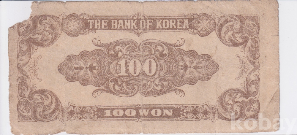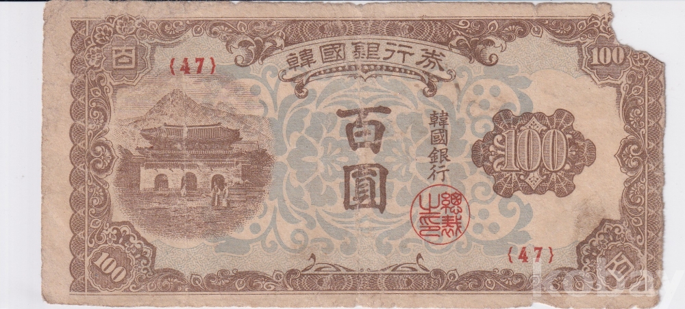 - 한국은행 1950년 광화문 백원 판번호 47번 사용제 지폐