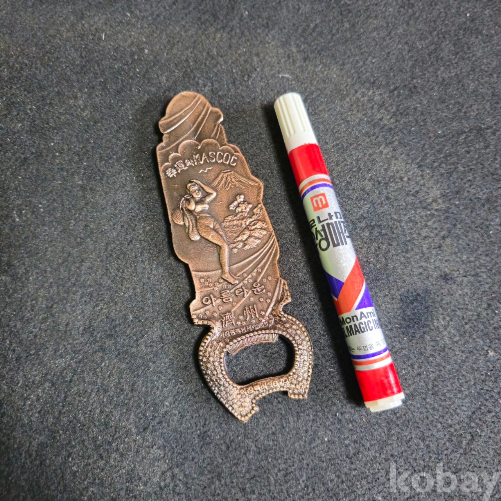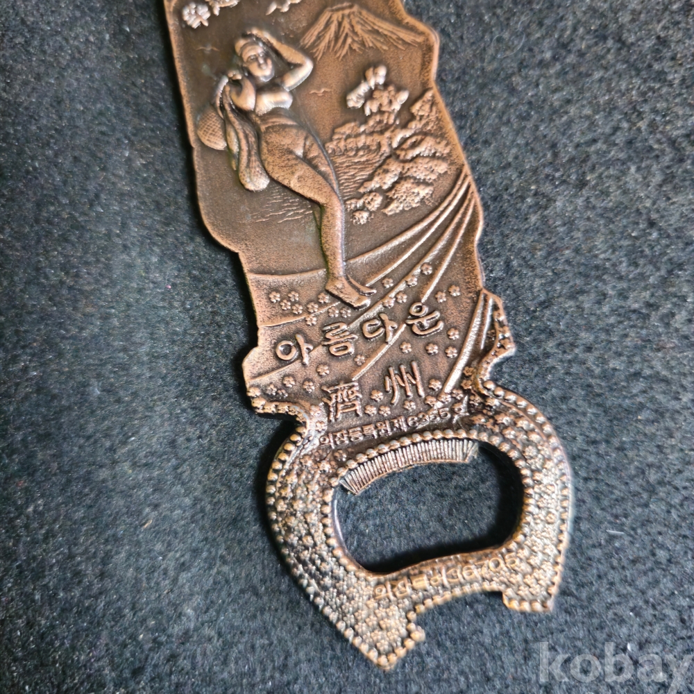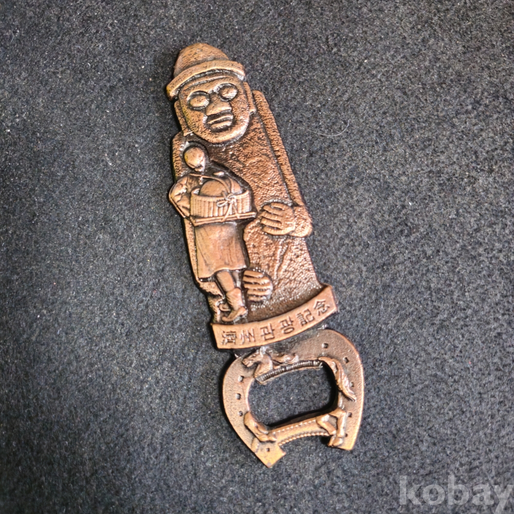 (((관광기념품/근현대사자료/오프너))) 오래전 제주관광기념 물허벅진여인과 하르방모습 금속 오프너