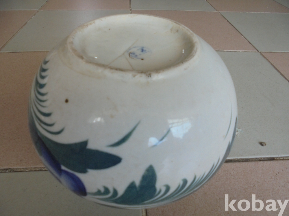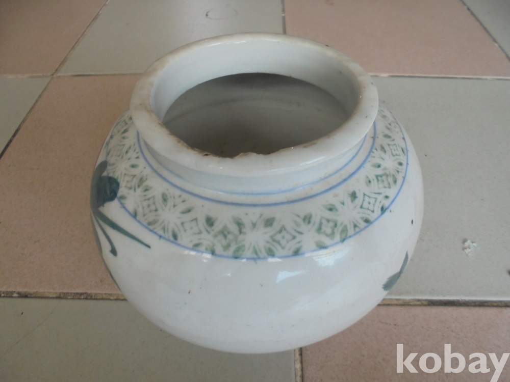 옛날 잘살던집이래야 사용하던 오래된 세월의 입등부근에 붙디친데있는 큰 백자 목단 양념 항아리