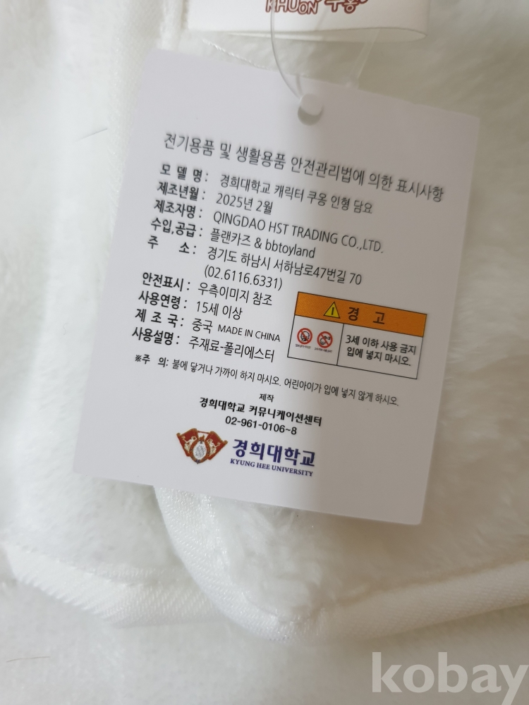 {천원경매} 9-2370 경희대학교 캐릭터 쿠옹 인형 담요-흰색(70*100)