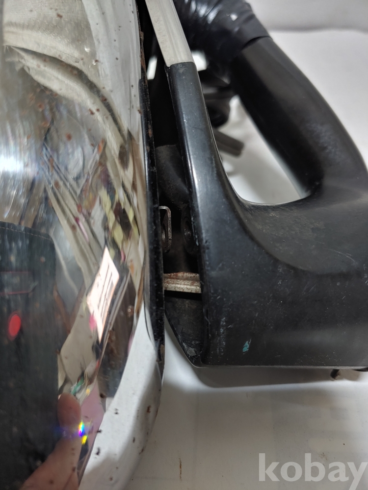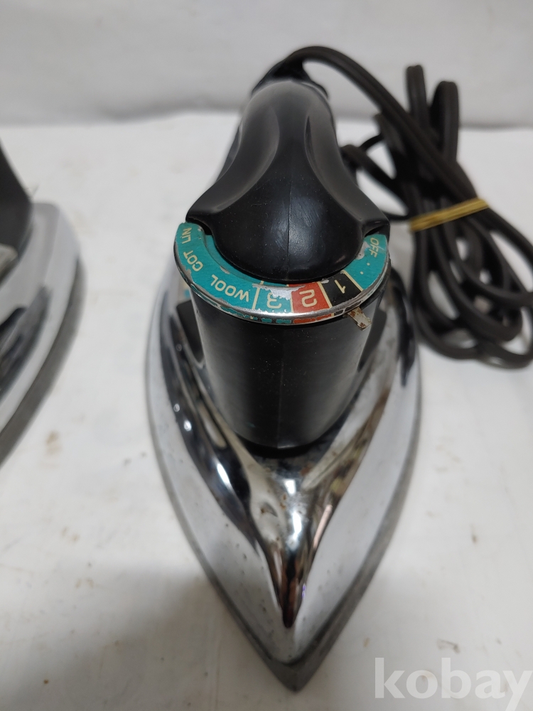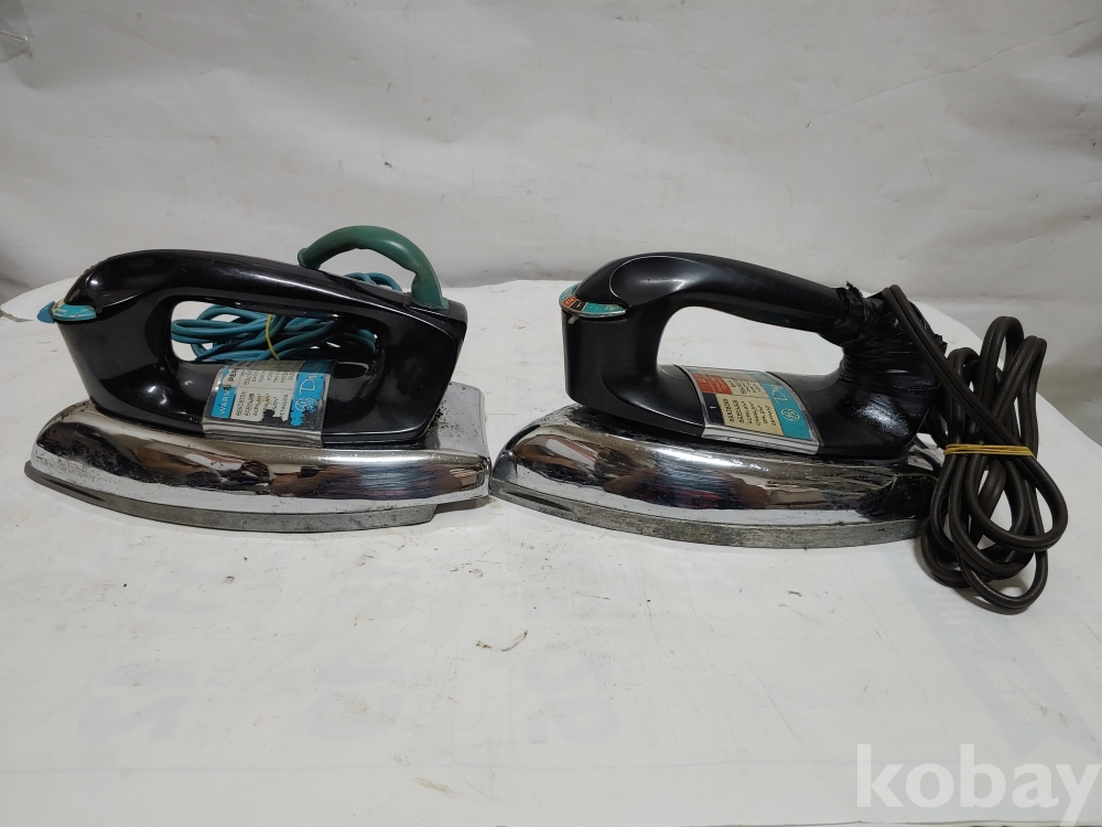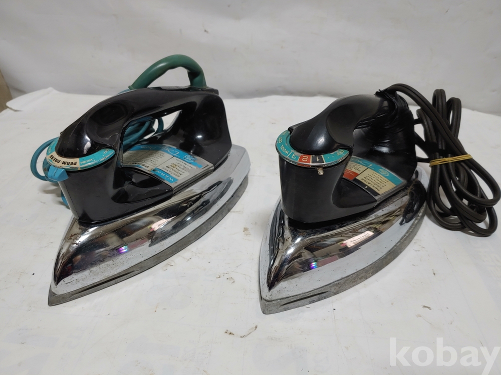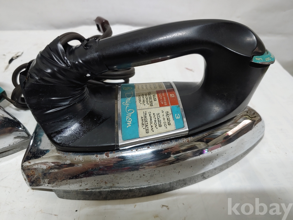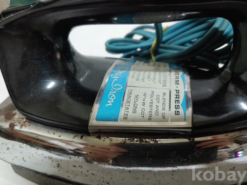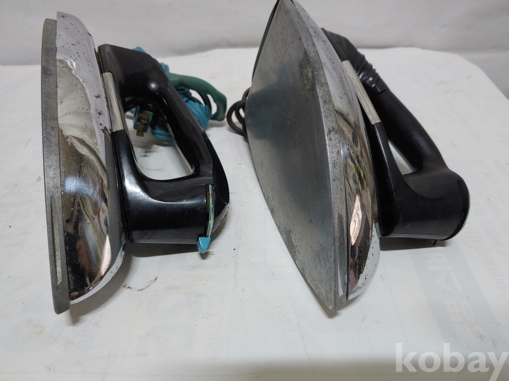 오른쪽에 있는 다리미에 테이프가 붙어 있는 부분이 있으며 앞면의 하단에 나사가 빠진 부분이 있으며 조절 노브의 끝부분이 없어요