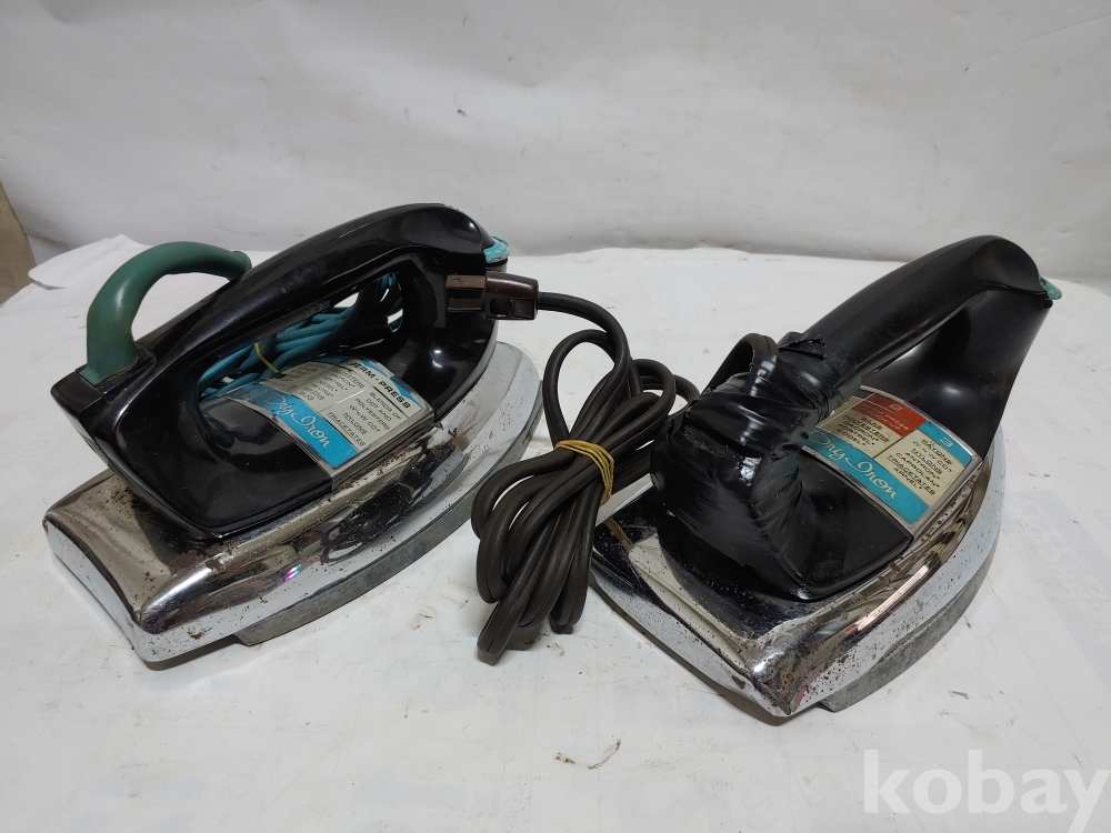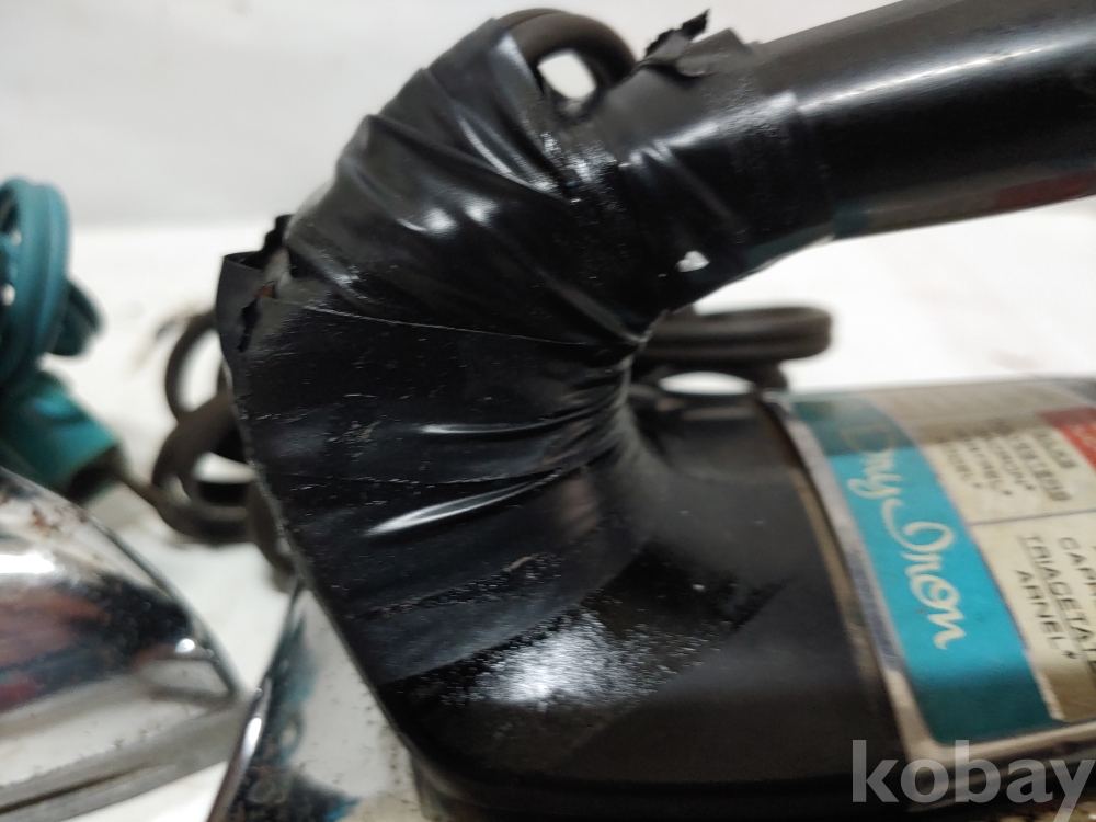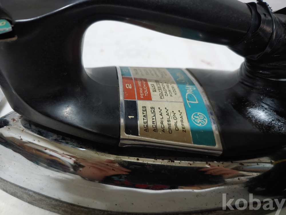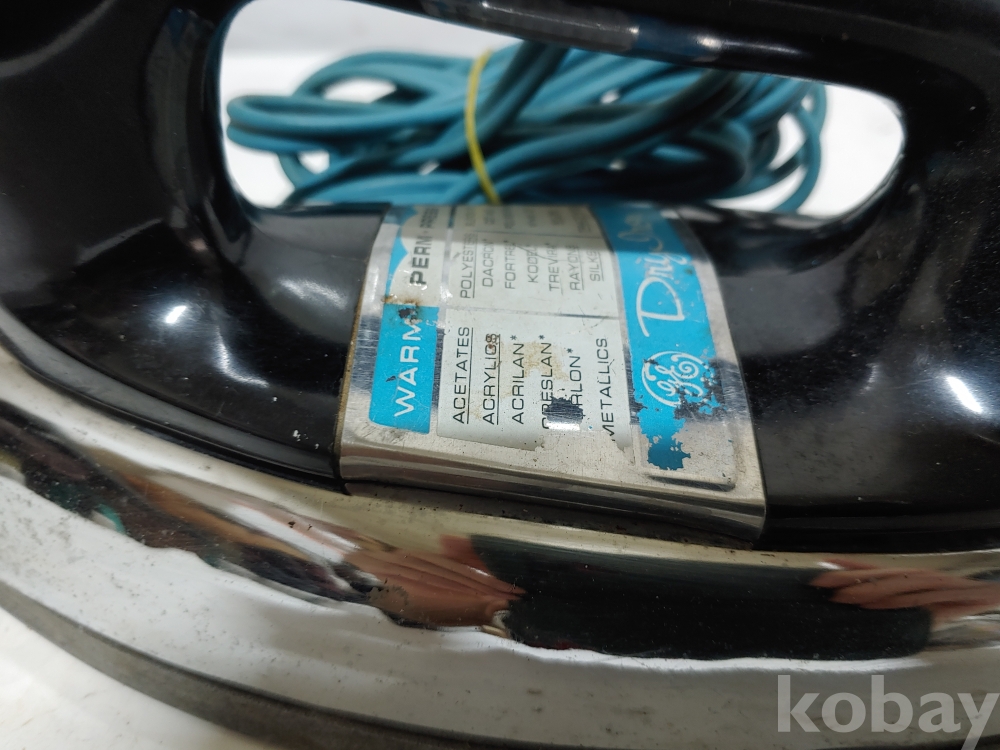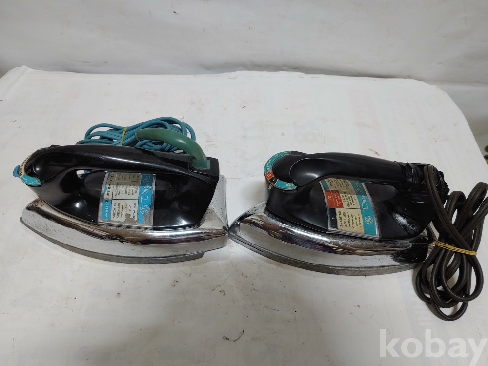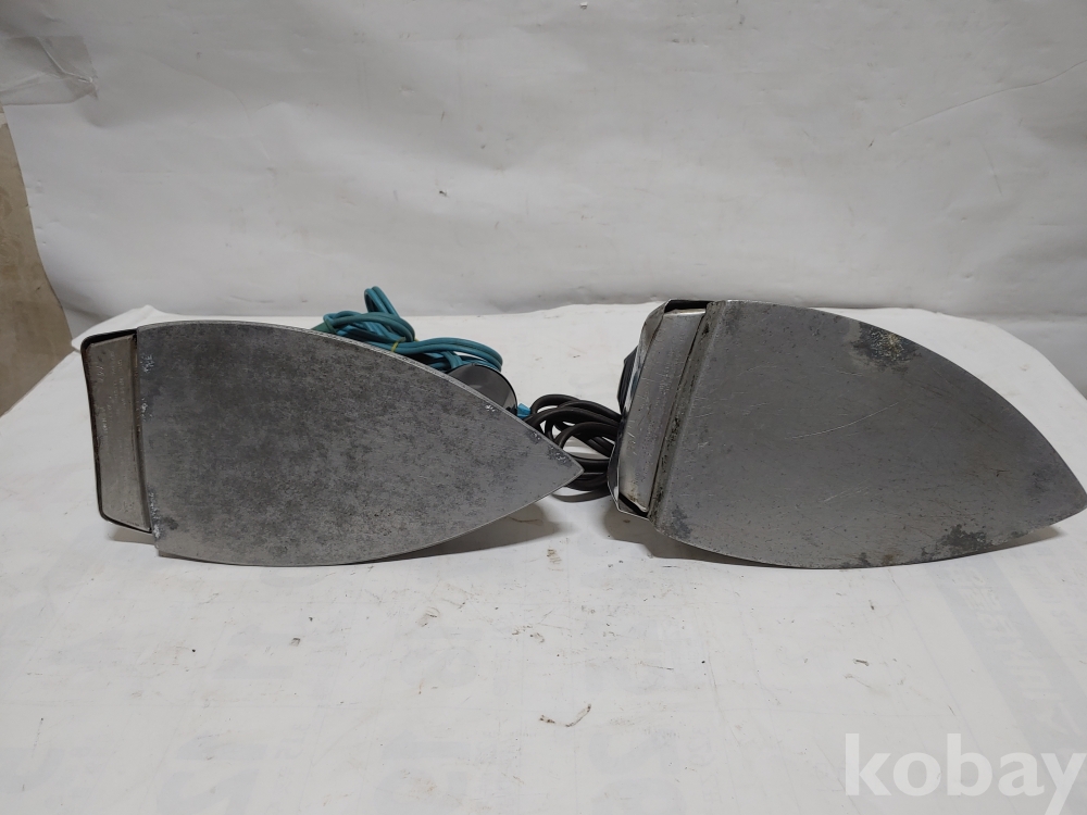 오른쪽에 있는 다리미에 테이프가 붙어 있는 부분이 있으며 앞면의 하단에 나사가 빠진 부분이 있으며 조절 노브의 끝부분이 없어요