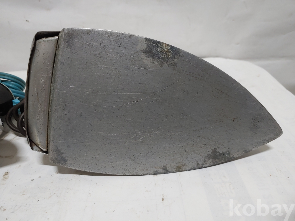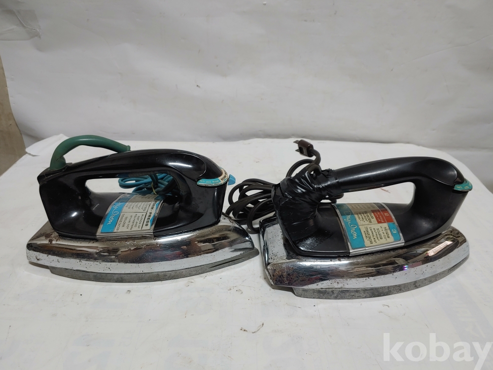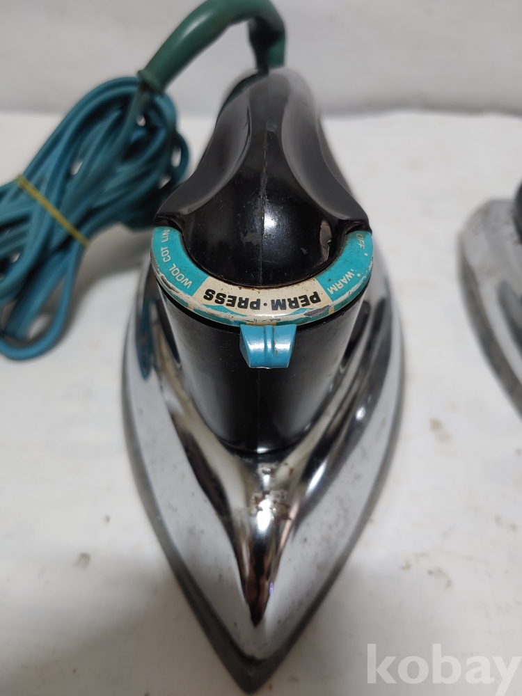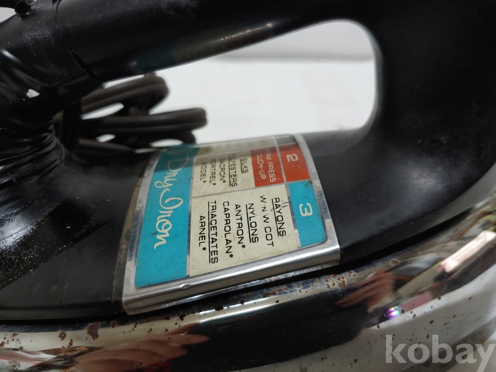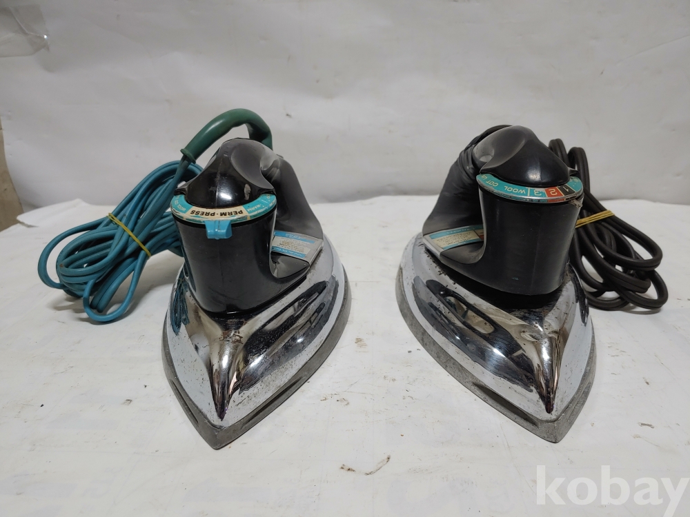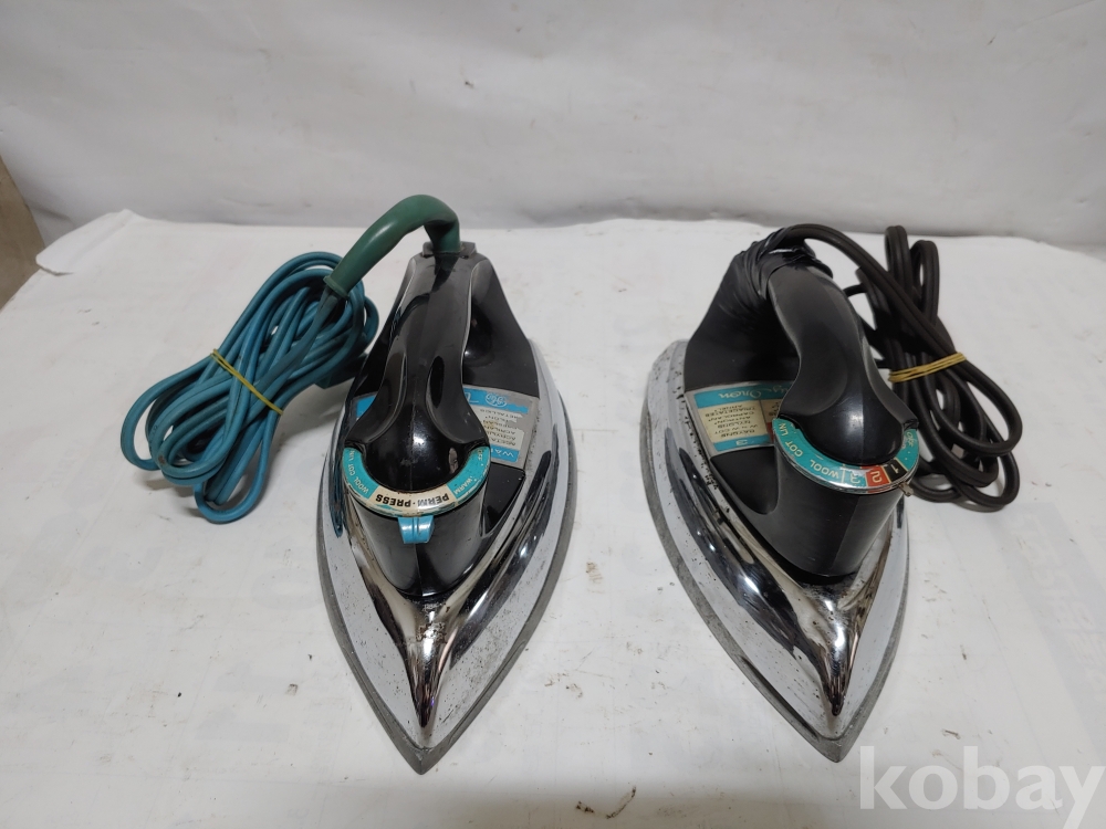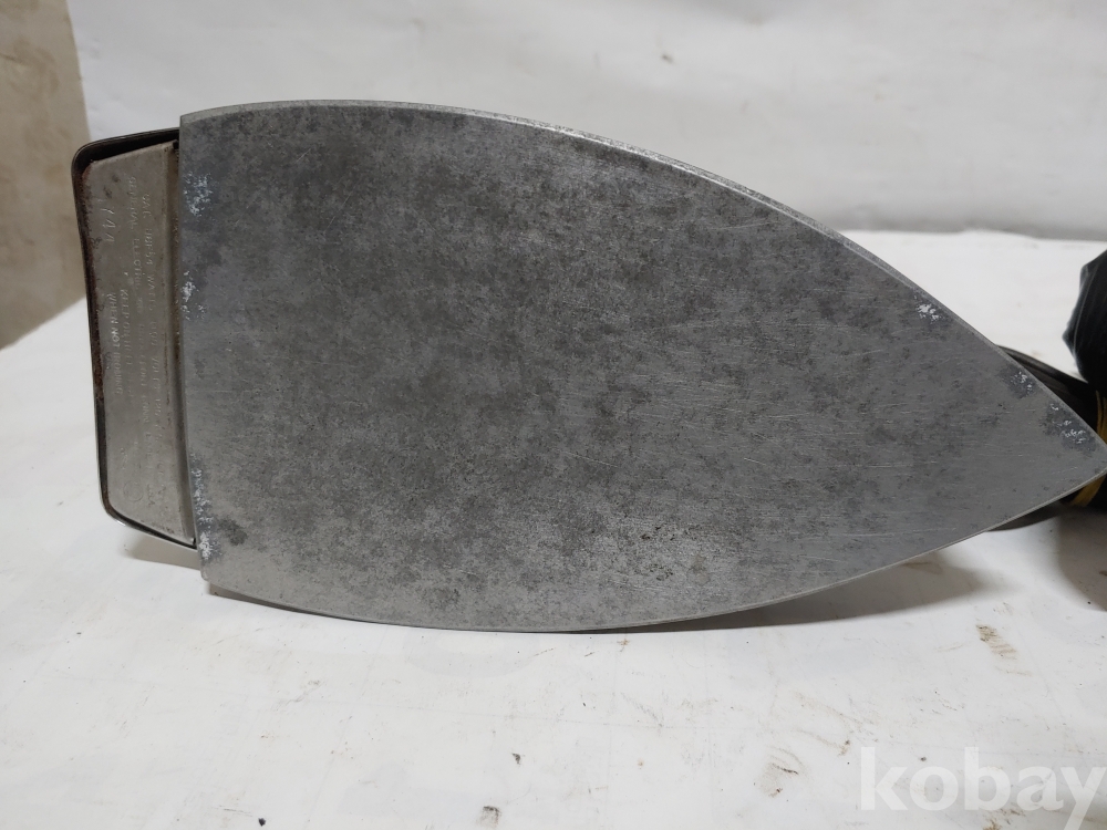 오른쪽에 있는 다리미에 테이프가 붙어 있는 부분이 있으며 앞면의 하단에 나사가 빠진 부분이 있으며 조절 노브의 끝부분이 없어요