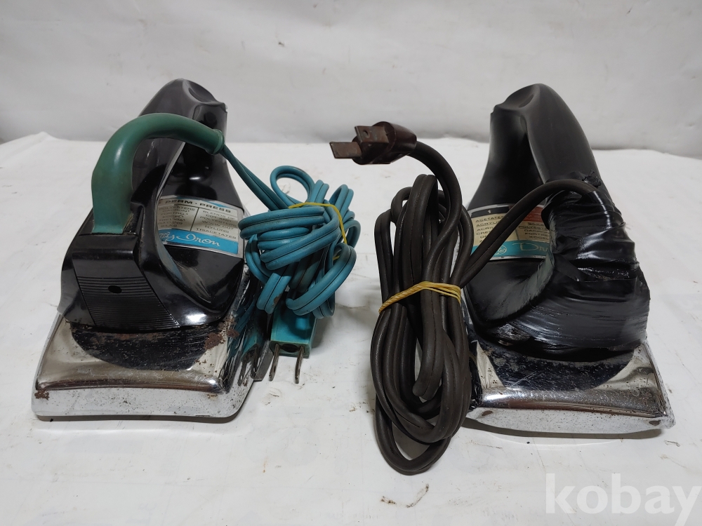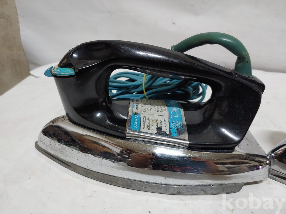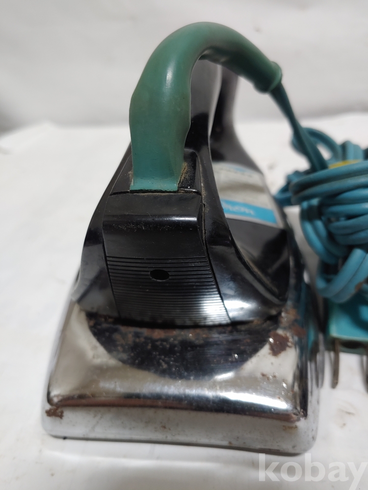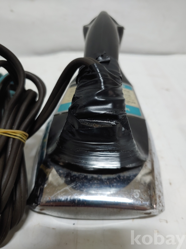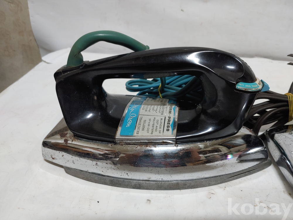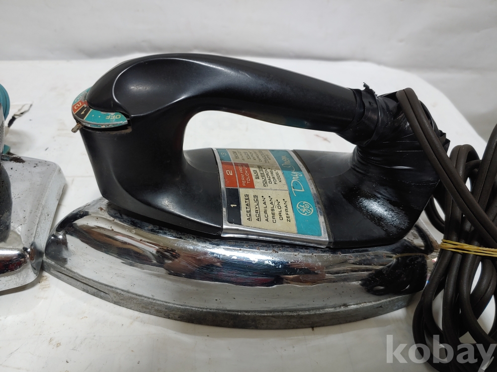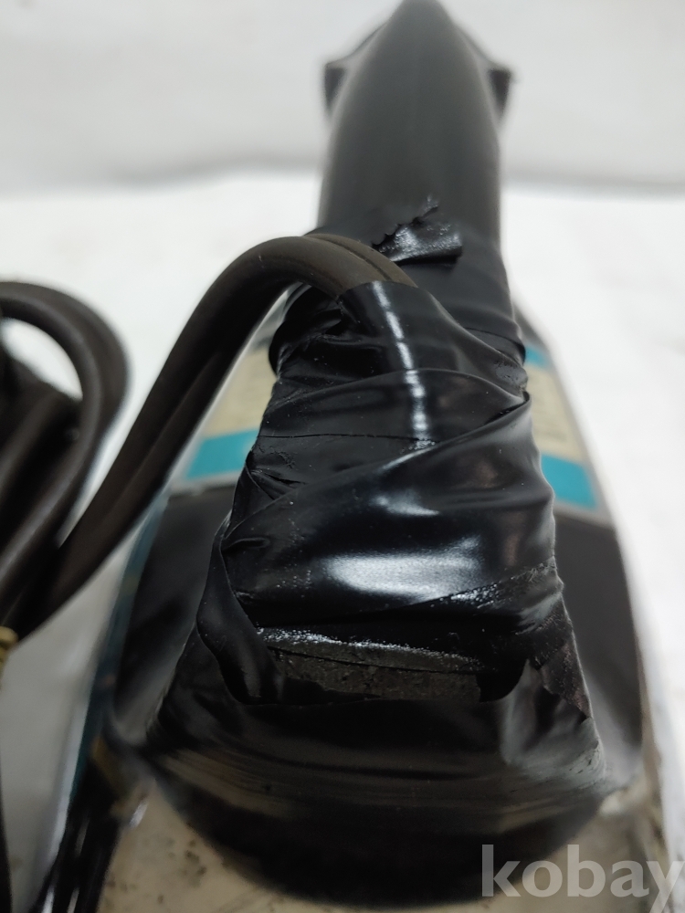 오른쪽에 있는 다리미에 테이프가 붙어 있는 부분이 있으며 앞면의 하단에 나사가 빠진 부분이 있으며 조절 노브의 끝부분이 없어요