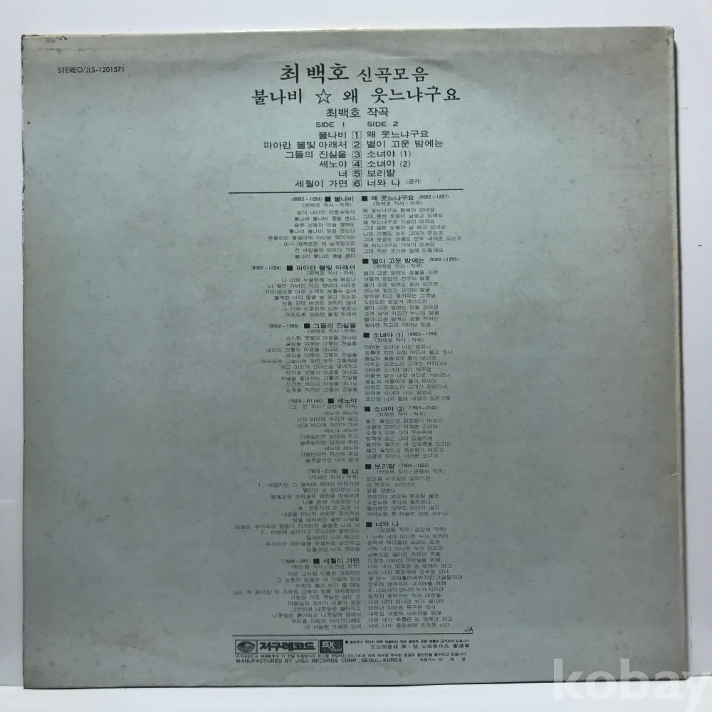 LP 34,700-22 최백호 신곡모음 - 불나비/ 왜웃느냐구요 _ ` 80 지구 자켓 EX+ 알판 EX