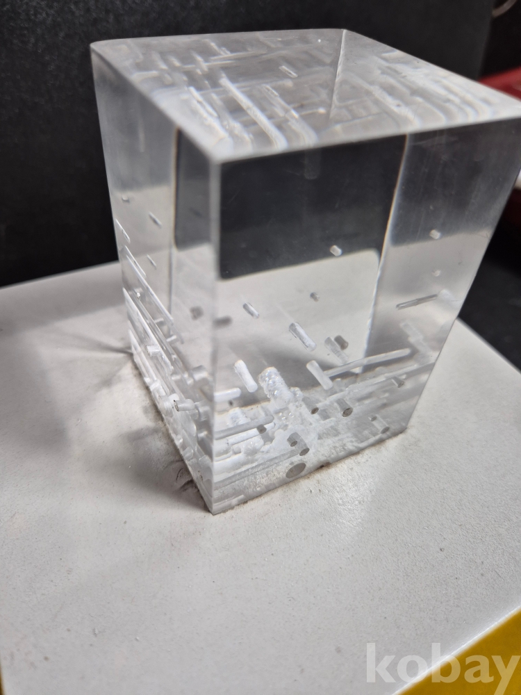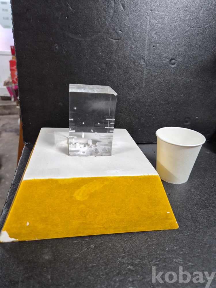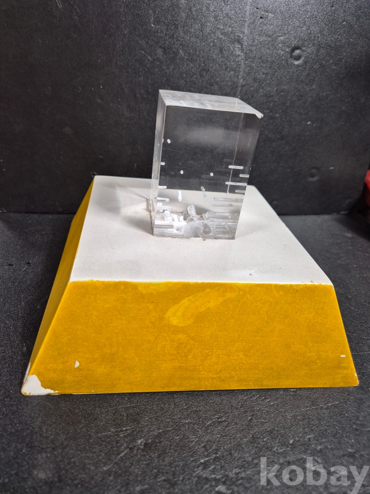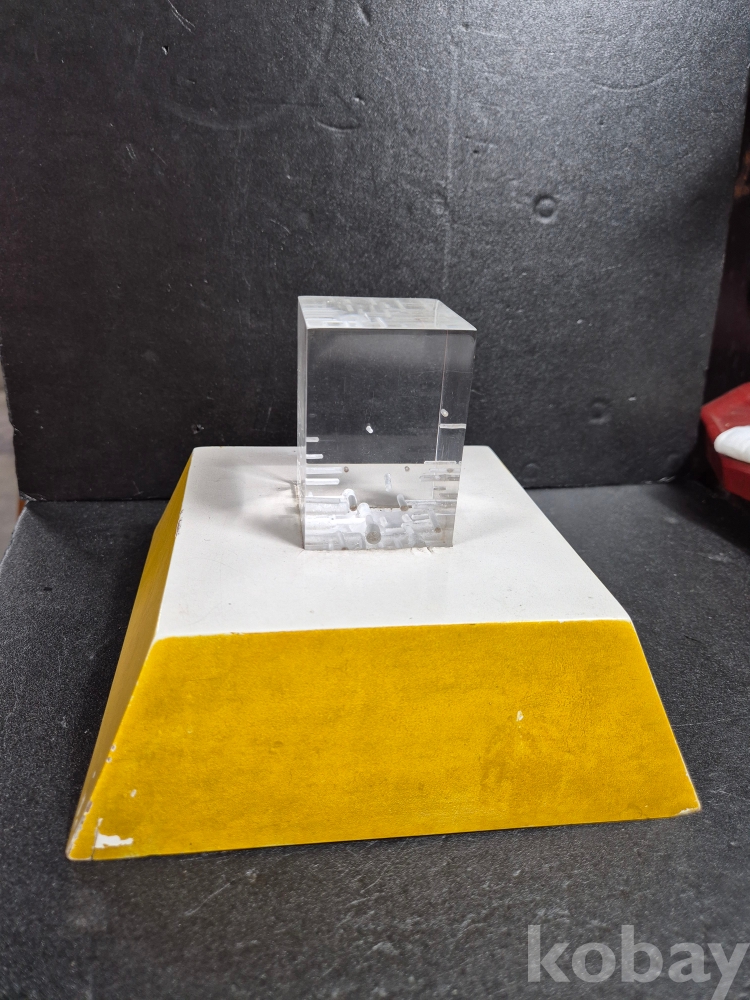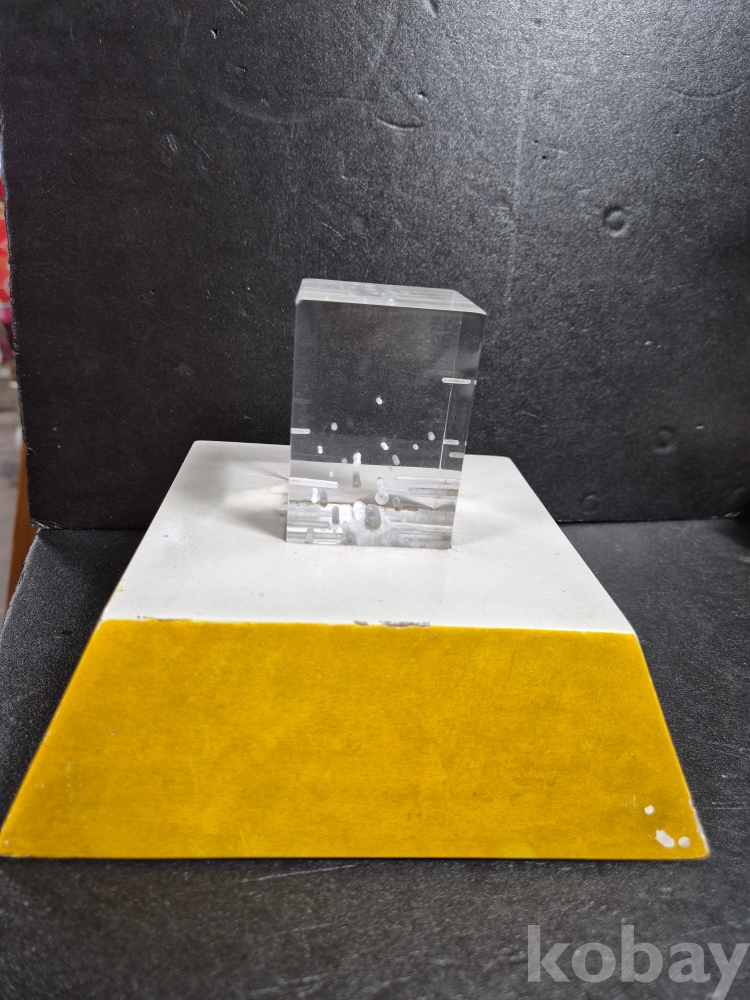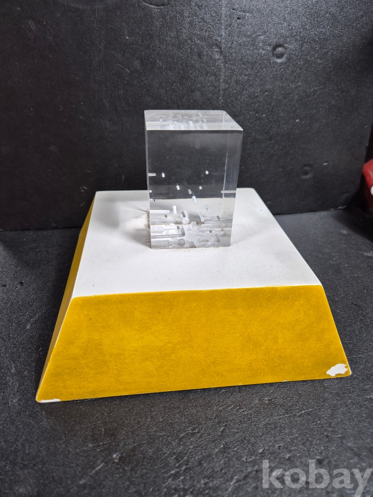 당 작품은 1985 김청정 작가의 작품으로 아크릴 재료로 만든 추상 작품이며 본체 작품 사이즈는 5.5cm x 5.5cm, 높이 8cm 입니다
