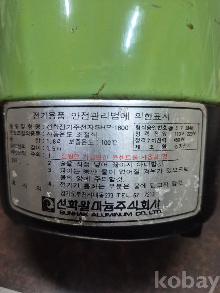 1980년대 선화 알루미늄 전기 주전자 SHP-1800 본체만 있어요 메이드 인 코리아 21*12*26