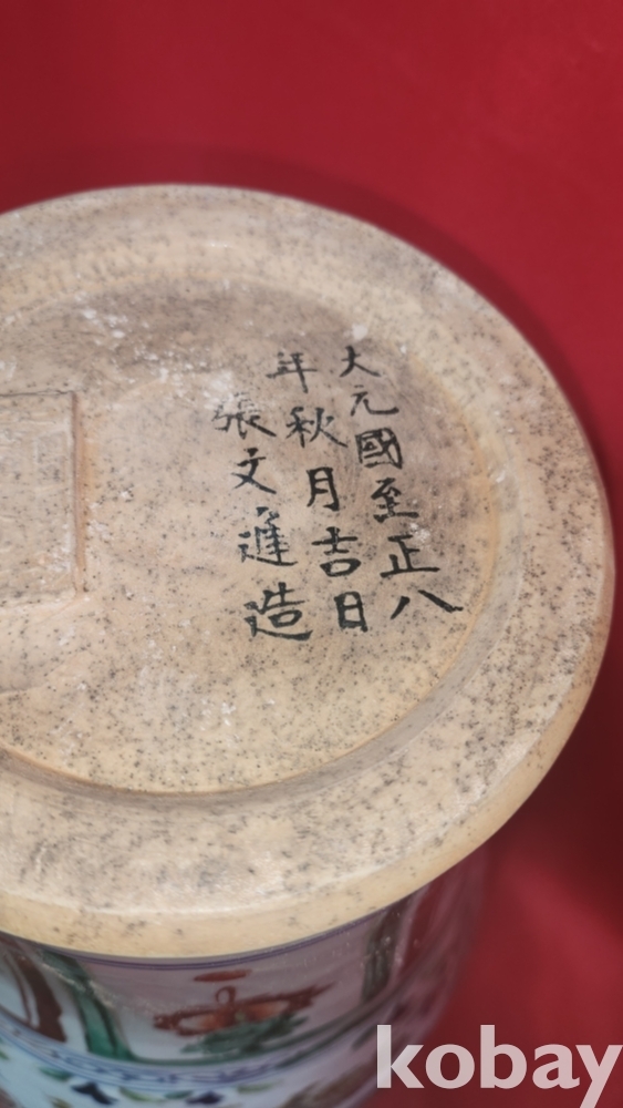 대원국 지정팔년 추월 길일(大元國至正八年秋月吉日) 장문진 조(造) 박릉제 관지 청화 유리홍 귀곡자하산도 문양