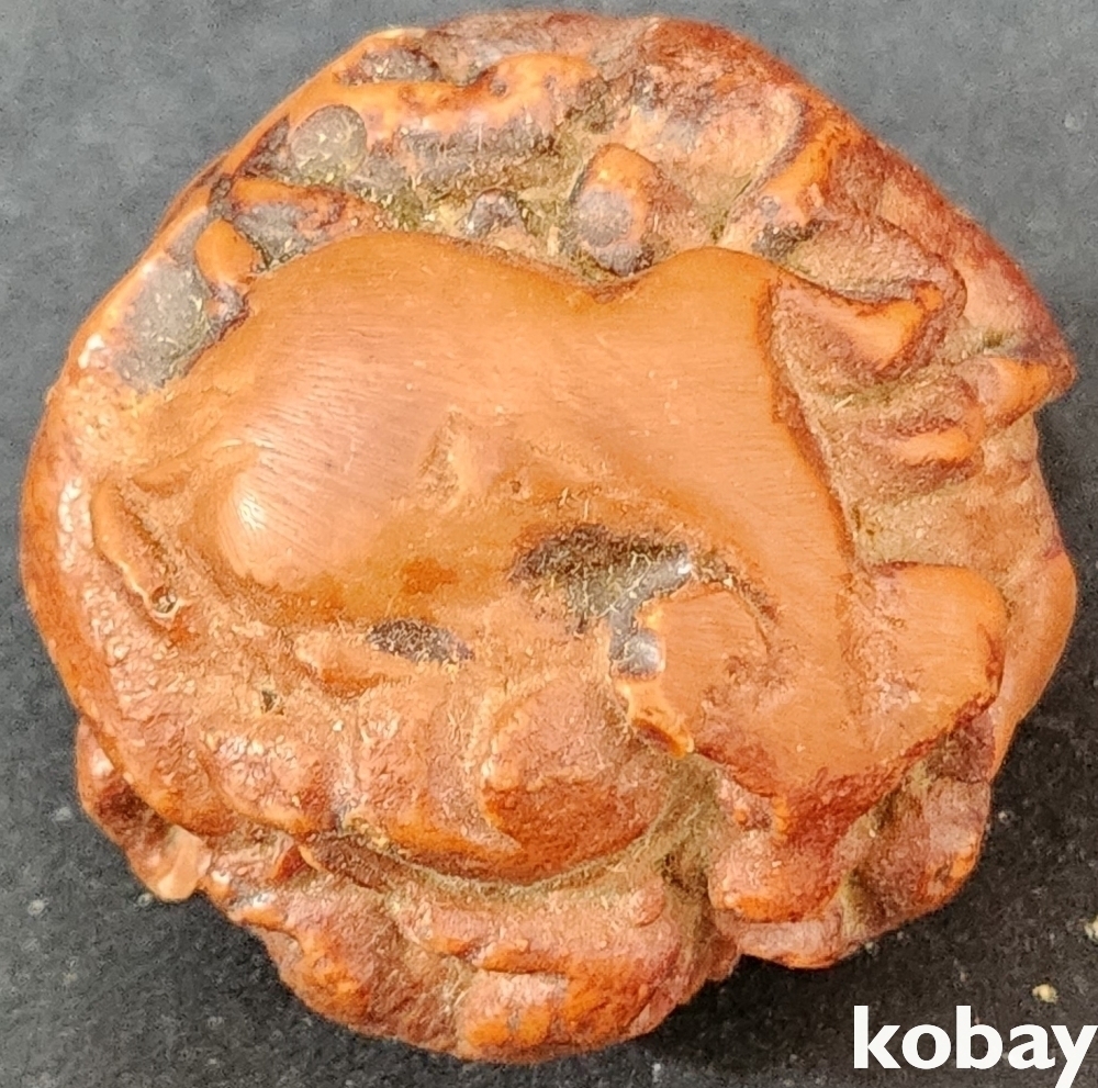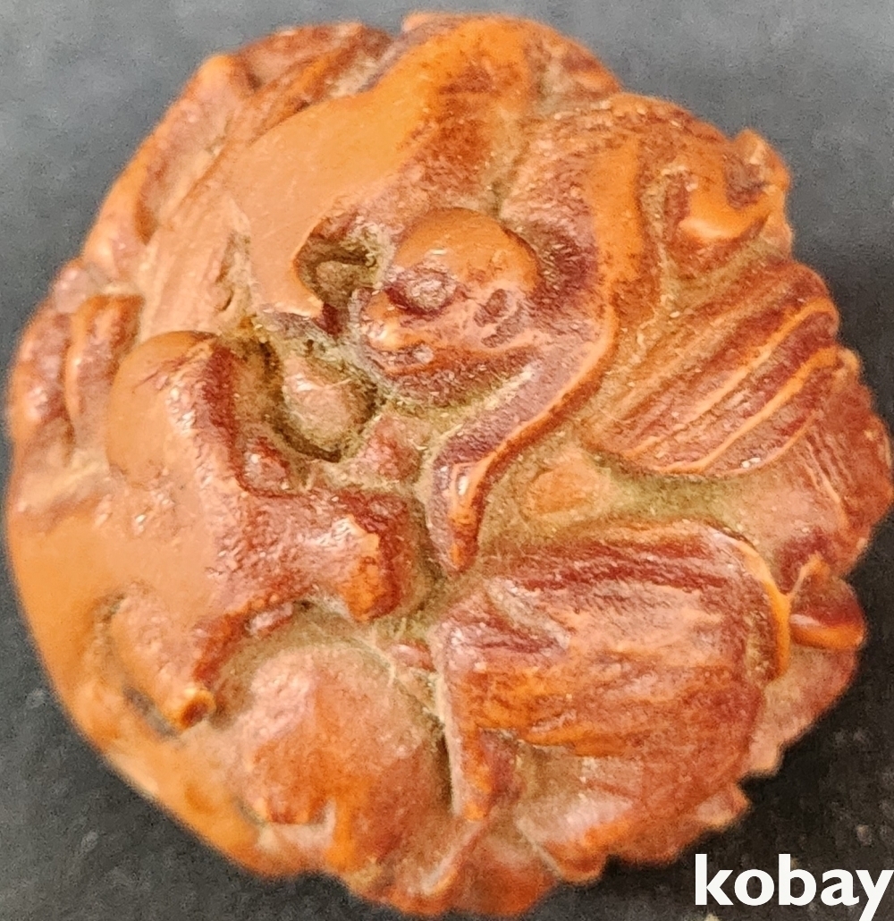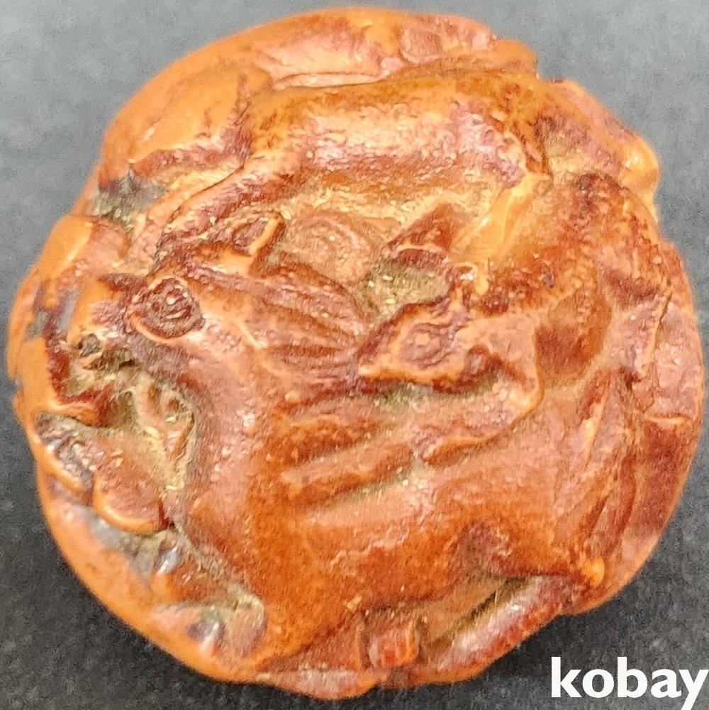 둥근 열매에 여러 동물을 조각한 열매 조각 손바닥 지압용품입니다,